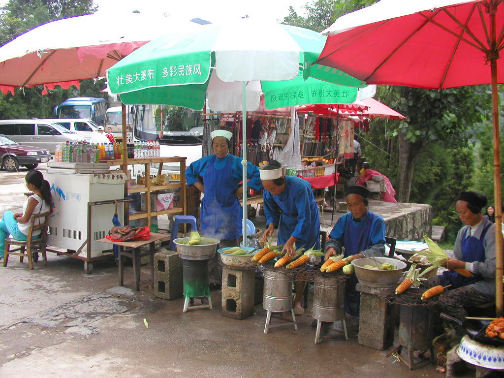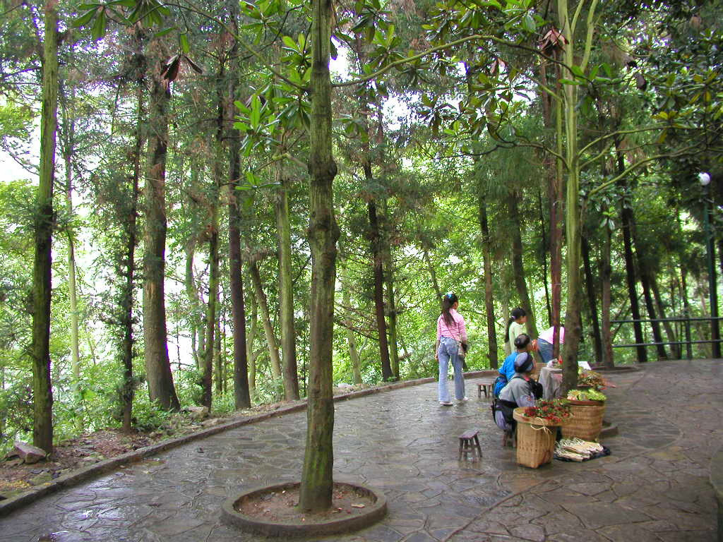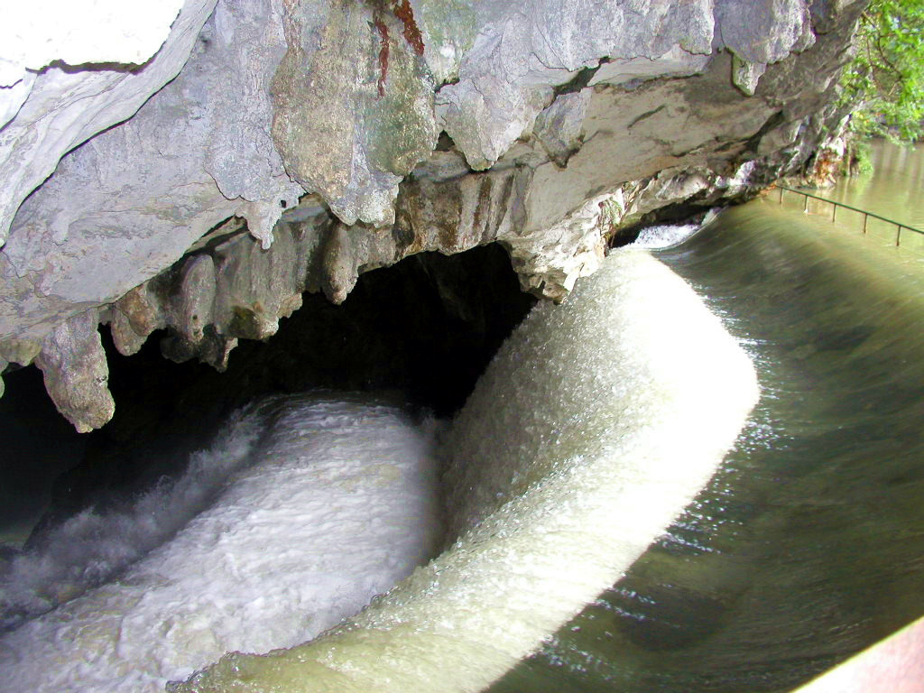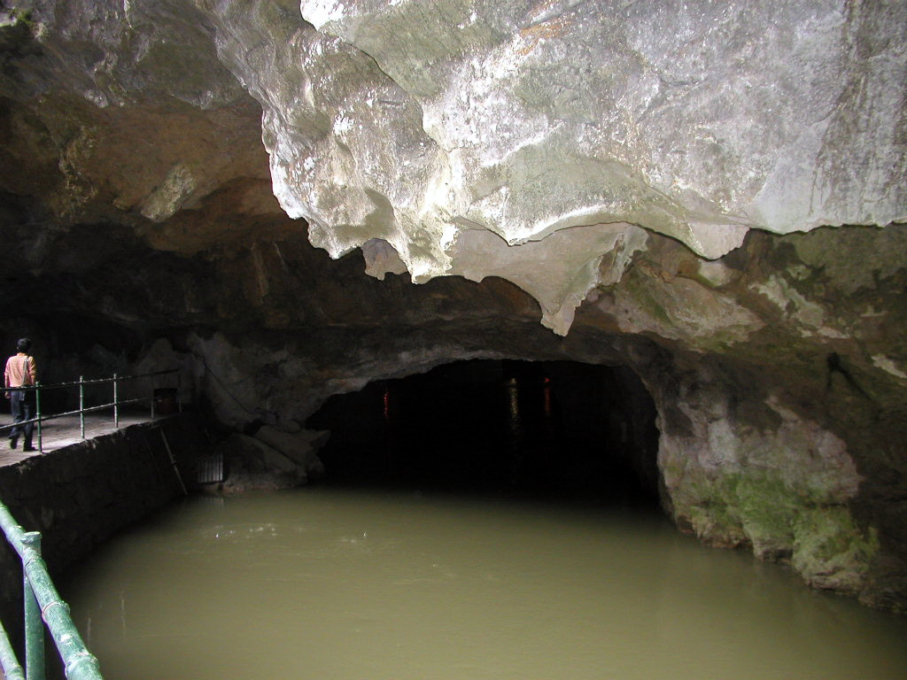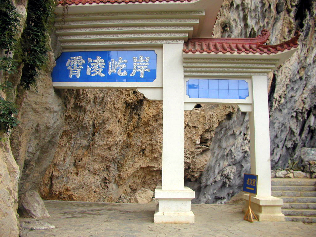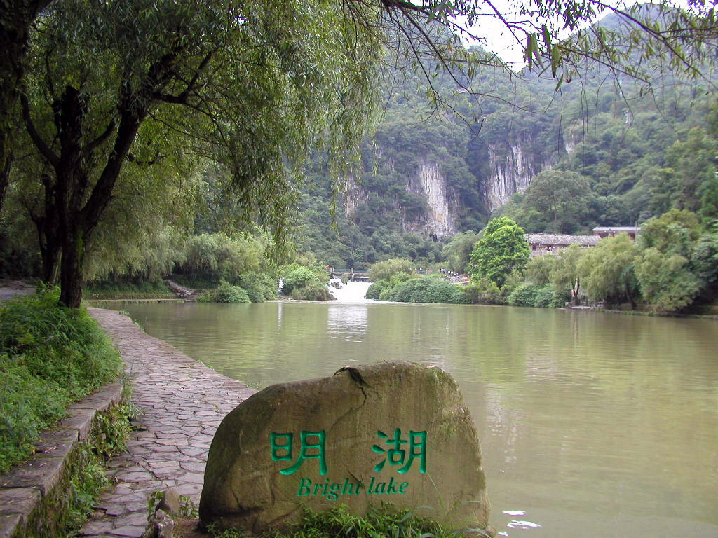 因为住在安顺,第二天一早就去了龙宫。这是国家级风景名胜区,距安顺市27公里,有高等级公路直达景区。因为到的早,还没有什么人。进入巨大的龙宫牌坊,我们走上了一条绿树成荫的甬路,道边都是卖各种旅游商品的小摊位,为了躲开人流,我们首先来到“天池”。龙宫风景区以水溶洞群为主体,更集旱溶洞、瀑布、峡谷、峰丛、绝壁、湖泊、溪河于一身,构成一幅怡然自得的人间仙境画图。天池是山谷捧出的一泓碧水,宛如天上瑶池,水色碧绿,显得平静幽深。走到池的一端,忽听巨大水声,这就是著名的龙门飞瀑了,因为头天下了雨,水流巨大,只见白花花的一片,怒吼着向下从巨大的溶洞跌拓而下,水墙壁立,宽25米,高约50米,惊涛奔涌,此即龙门。传说当年神龙从山中伸出头来,一支龙角穿破山崖,露出天窗,龙从天窗跃出,形成了巨大的龙门飞瀑。据称这里为中国地下瀑布之冠。