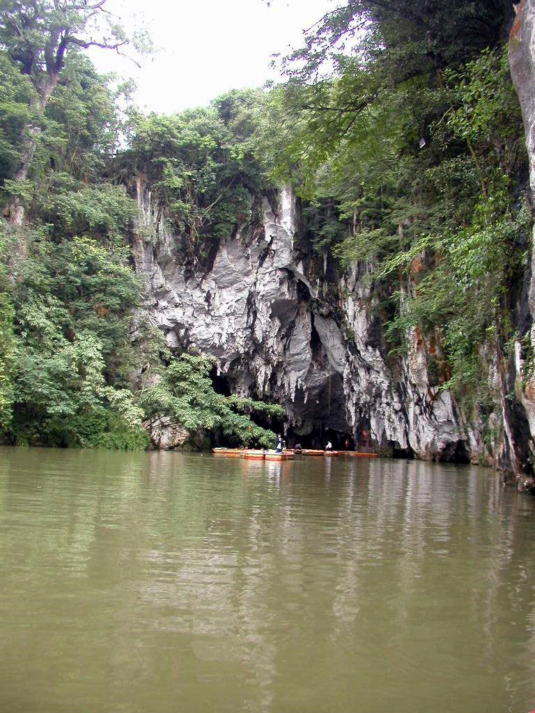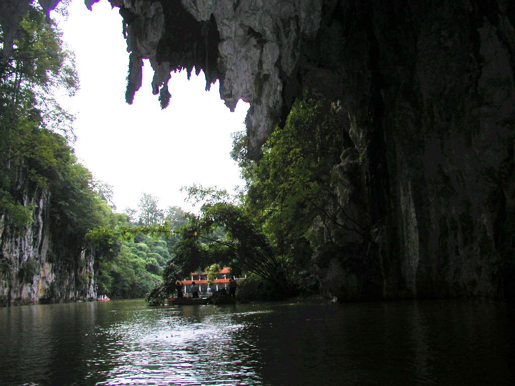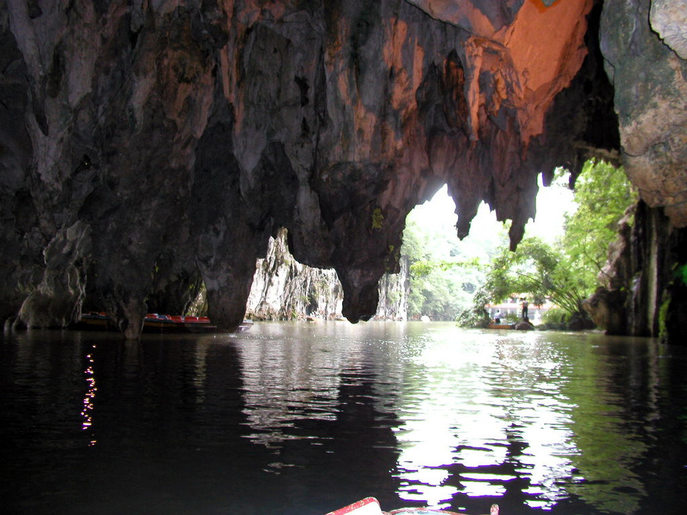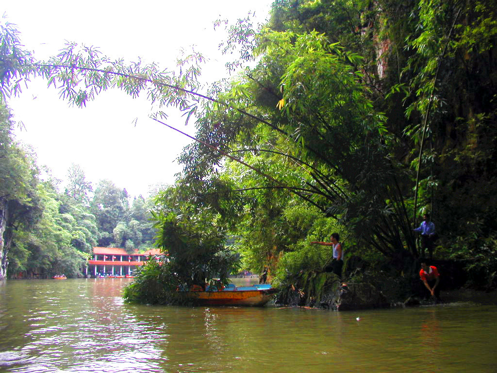 进龙宫是要坐船的,小船不大,可以乘7、8个人。我们一行4 人,前有导游讲解,后有船工摇橹,悠哉游哉。天池原是暗河的出口,因有龙门飞瀑泄水,所以这里水位涨落不大。小舟缓缓前行,犹如巨大的盆中的小树叶,潭水沉碧如玉,水面宽阔,三面悬崖峭壁,青藤倒挂,古木森森,据说这里因湖、洞、植物的和谐,共同营造了得天独厚的小气候,常年恒温不说,还屏蔽了各种辐射,产生了大量的负氧离子,是一个有利身体健康的好地方。