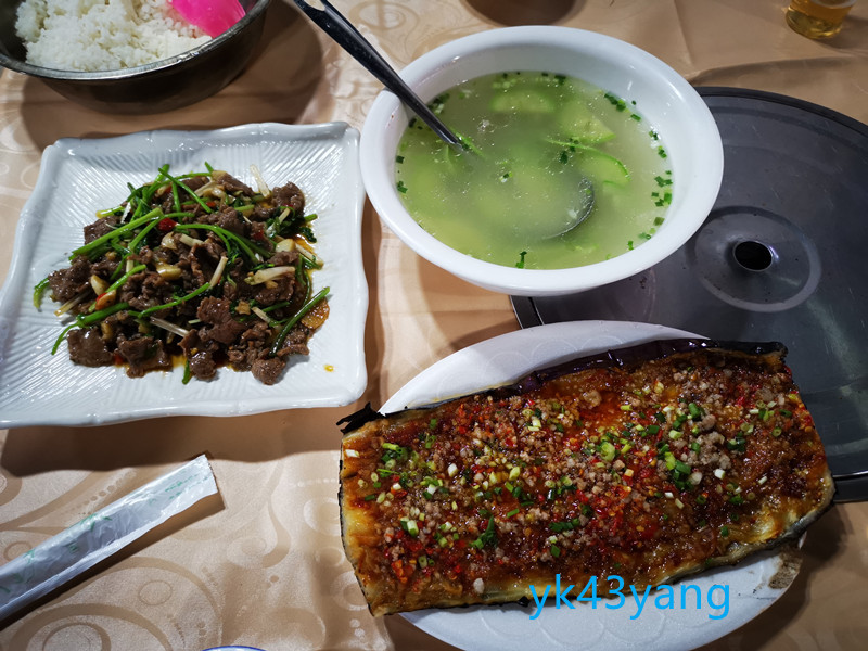 来到酒店附近的美食街,找了一家顺眼的,点了一盘炒牛肉,一盆烤茄子。一碗白菜丸子汤。安顺的牛肉比起太原的来,要好很多。此外,烤茄子也很好吃。贵州在烧烤方面,还是很有讲究的。