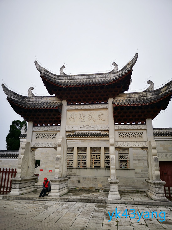 这是路边新建的石牌楼。四柱三门三滴水歇山顶,额题为“文武圣神”。