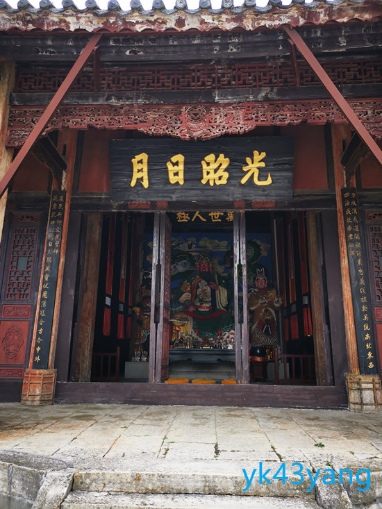 大门上方挂有横匾,题曰:“光照日月”,廊柱上悬挂楹联:“力扶汉鼎,道阐麟经,秉忠义伐魏拒吴,统南北东西,四海咸钦帝君仙佛;气禀乾坤,心同日月,显威灵伏魔荡寇,合古今中外,万民共仰文武圣神。”