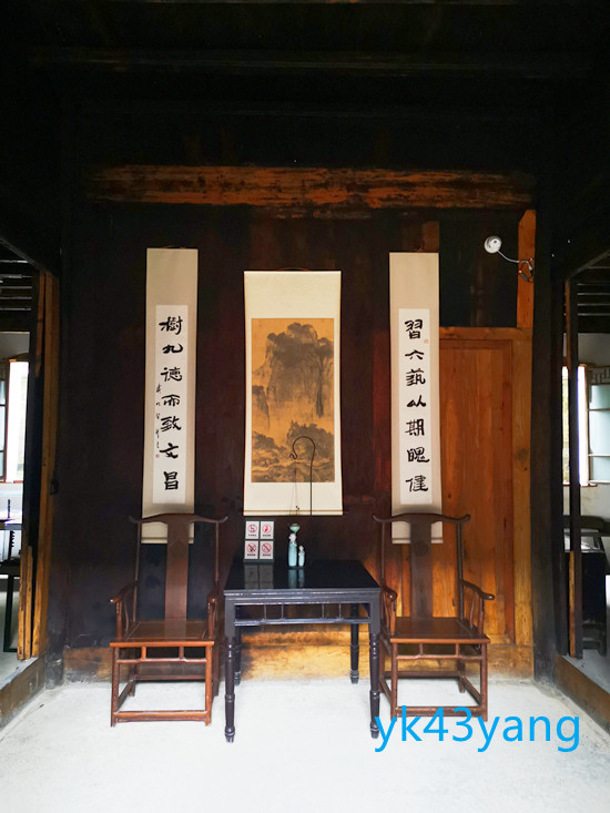 正屋布置为堂屋,正面有方桌和两把椅子。墙上有中堂国画和楹联:“习六艺以期魄健;树九德而致文昌”。