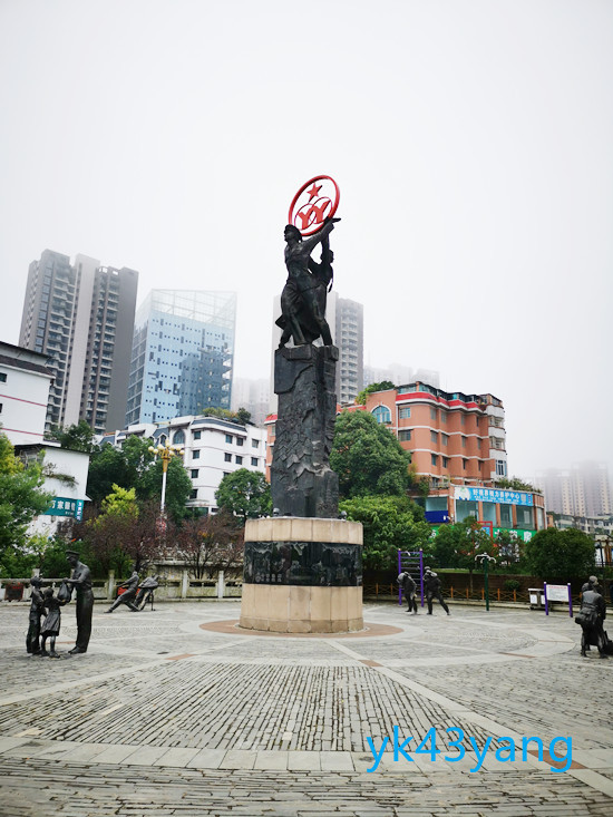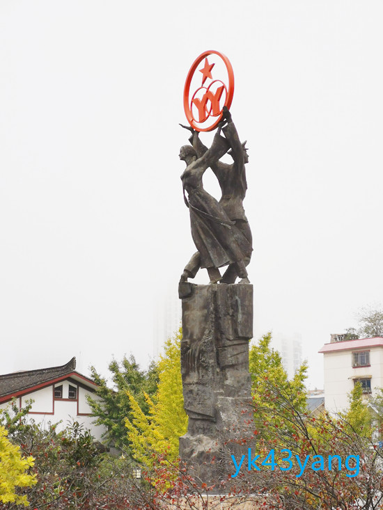 王若飞广场中央耸立的雕塑象征着军民团结的双拥精神:即拥军优属和拥政爱民。