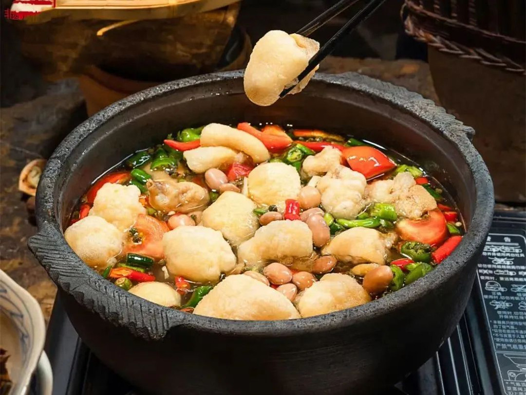 灌汤猪脚,是一道起源于600年前的特色屯堡菜,猪脚经过多次脱水、脱脂的油炸处理,搭配本地调味料和不同口味的汤底,软糯入味,深受食客喜爱。2022年3月被收入西秀区非物质文化遗产代表性项目名录。在今年由贵州省烹饪饭店行业协会主办、中国黔菜研究院协办的“贵州十大地标菜发布展示交流品鉴会”上,入选为“贵州十大地标菜”。