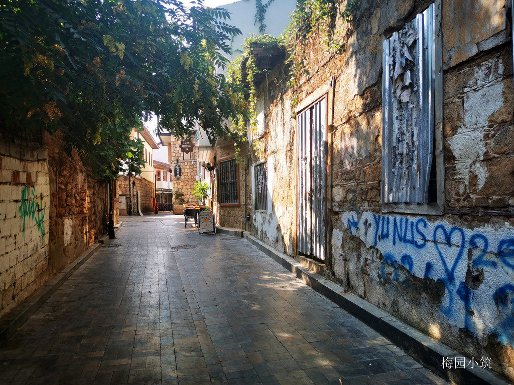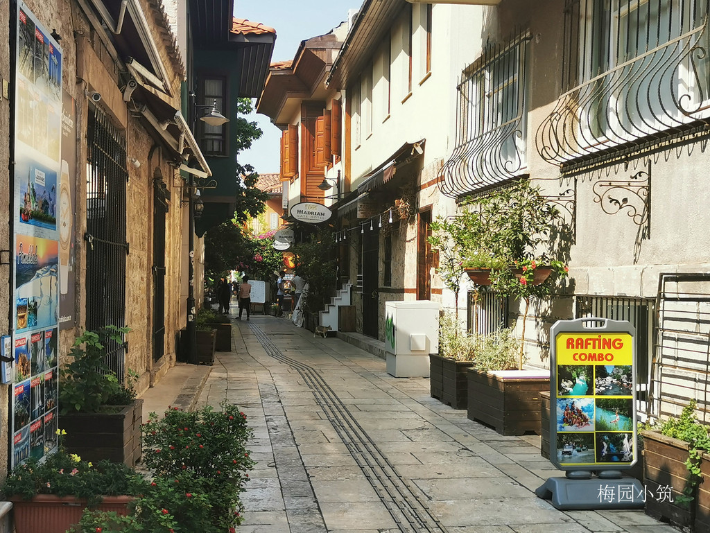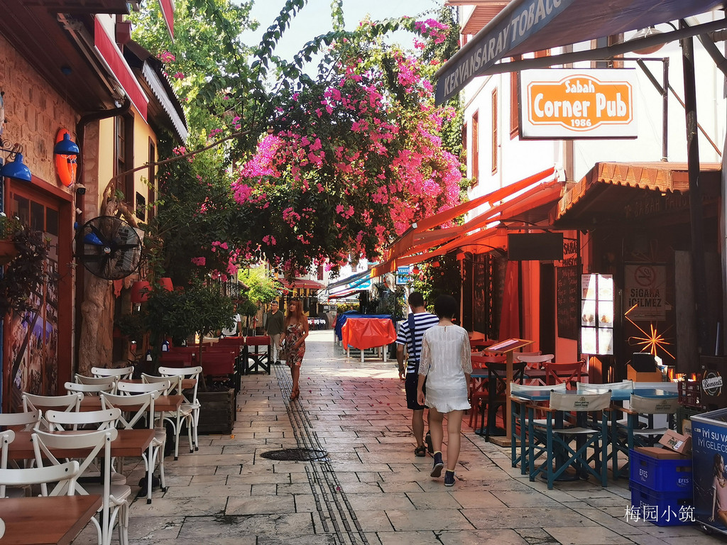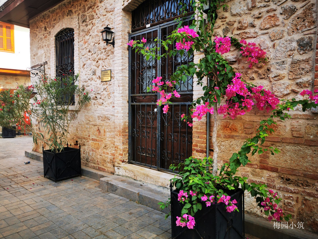 城门两边各有一座高塔,分别属于罗马和塞尔柱时期的建筑。踩着拥有上千年历史的鹅卵石步道,穿越哈德良门,这一刻就仿佛穿越回安塔利亚的旧时光,看尽繁华落幕后,沉淀下来的历史痕迹都不免让人怅然。古城风貌如中世纪,密布的是大大小小地中海风格中低层楼房,或别墅,或公寓,仿佛都是由巨大的石块堆砌而成。石板铺砌的街道并不宽敞,有些通道只能容三四人并行。一如欧洲的许多小镇,街巷两侧的建筑物,总是点缀着各式的绿色植物,各色的鲜花,以三角梅最为耀眼,总是嚣张地把枝条覆盖过大半个巷道,时时让路过的游客带下一两瓣花片,宛如留客的卡片