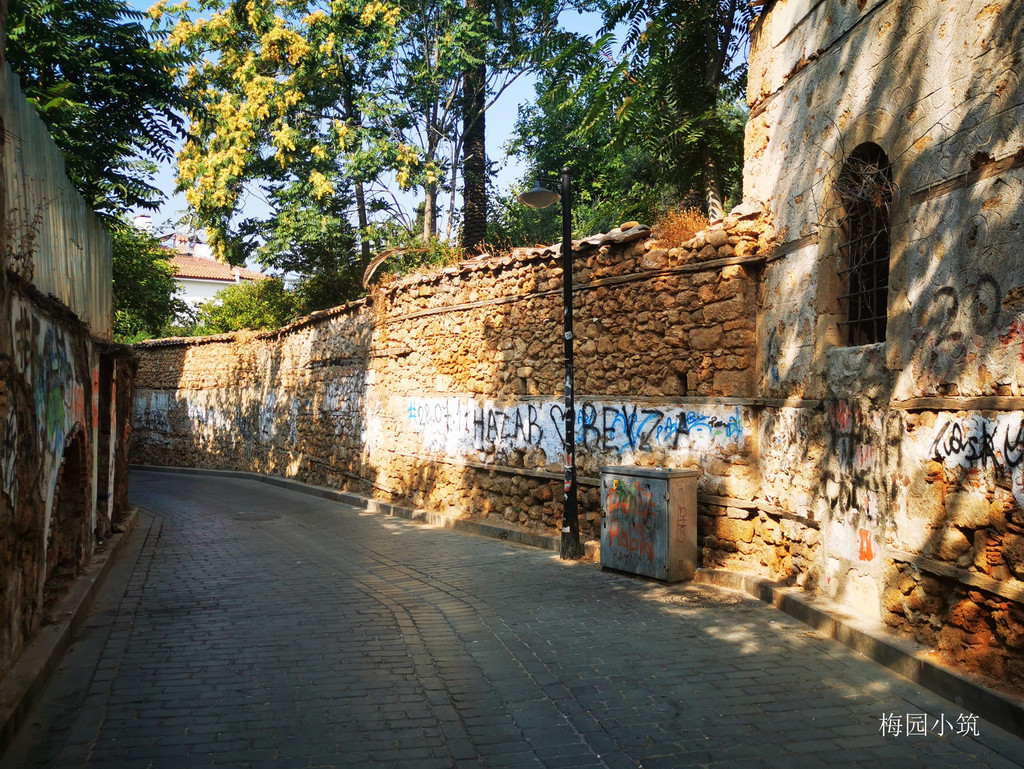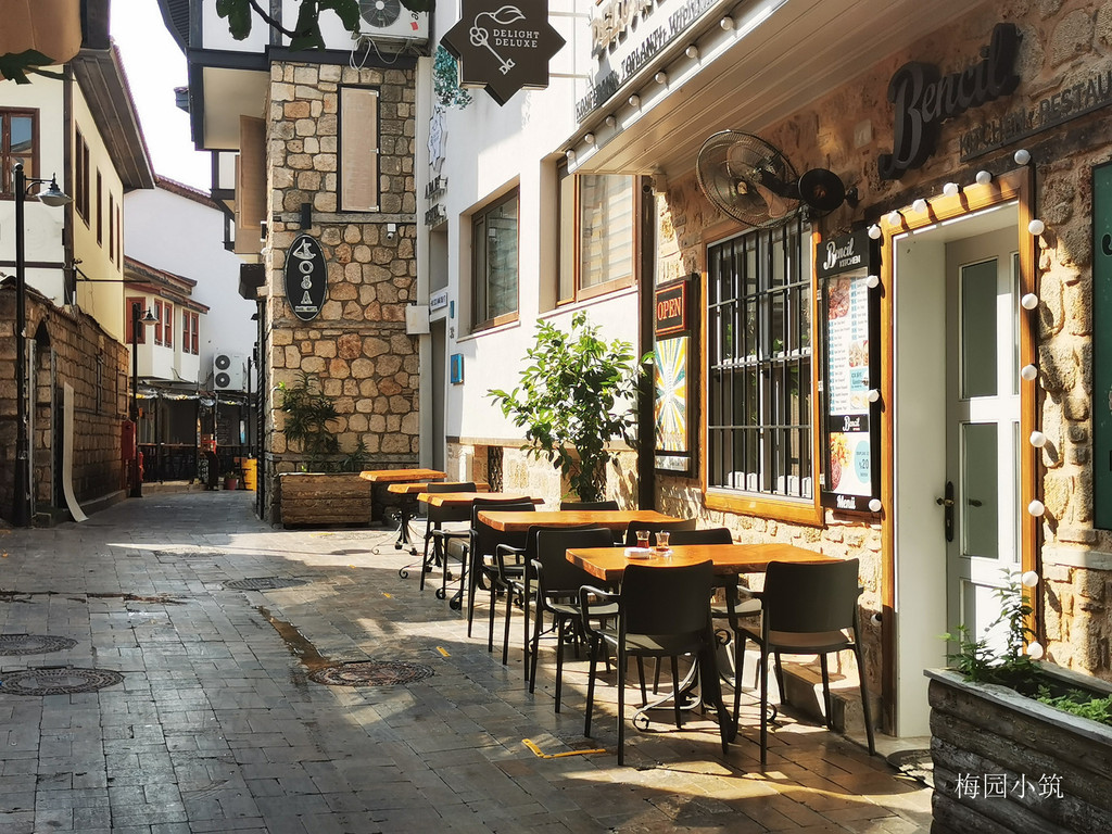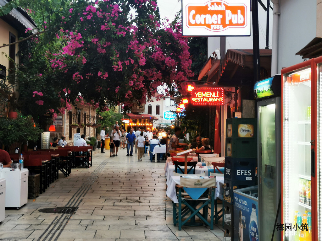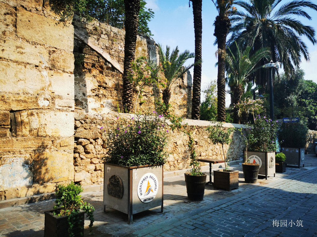 城门两边各有一座高塔,分别属于罗马和塞尔柱时期的建筑。踩着拥有上千年历史的鹅卵石步道,穿越哈德良门,这一刻就仿佛穿越回安塔利亚的旧时光,看尽繁华落幕后,沉淀下来的历史痕迹都不免让人怅然。古城风貌如中世纪,密布的是大大小小地中海风格中低层楼房,或别墅,或公寓,仿佛都是由巨大的石块堆砌而成。石板铺砌的街道并不宽敞,有些通道只能容三四人并行。一如欧洲的许多小镇,街巷两侧的建筑物,总是点缀着各式的绿色植物,各色的鲜花,以三角梅最为耀眼,总是嚣张地把枝条覆盖过大半个巷道,时时让路过的游客带下一两瓣花片,宛如留客的卡片