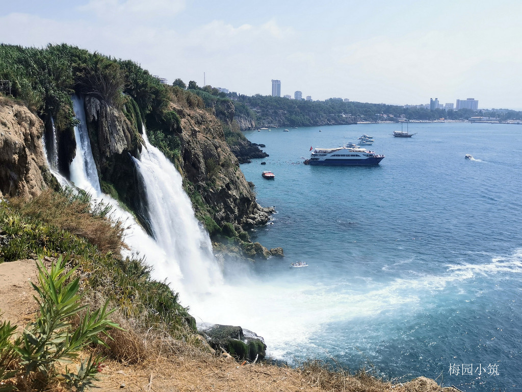 安塔利亚郊区的石灰岩地形分布着几处水势盛大的瀑布,其中以杜登瀑布最值得观看。瀑布分为上下两区,上瀑布在安塔利亚东北方切出一条14公里长的美丽峡谷,顺着瀑布地势串联出许多自然步道,不同角度、每个转弯都能呈现出瀑布万马奔腾的气势。不过,因为要赶去棉花堡,实在没有时间一探究竟,于是,只是在瀑布区下方,欣赏那水势湍急的河流,倾泻而下汇入地中海,那壮观的气势,令人叹为观止