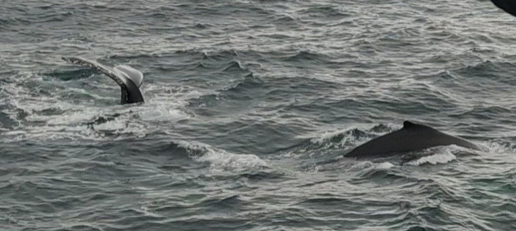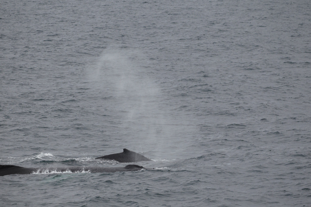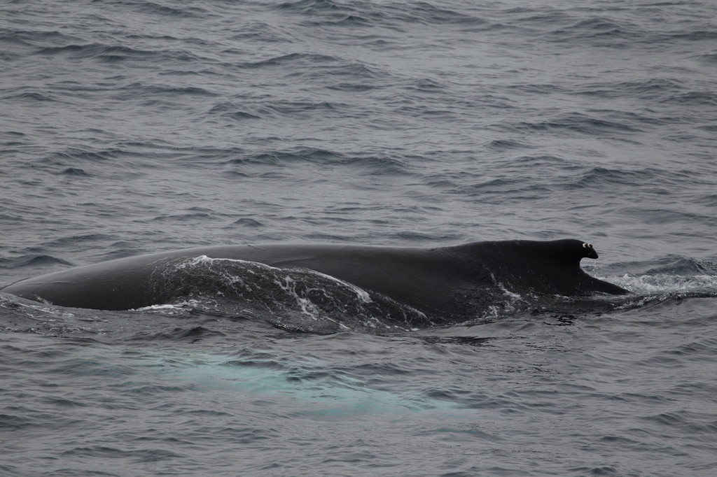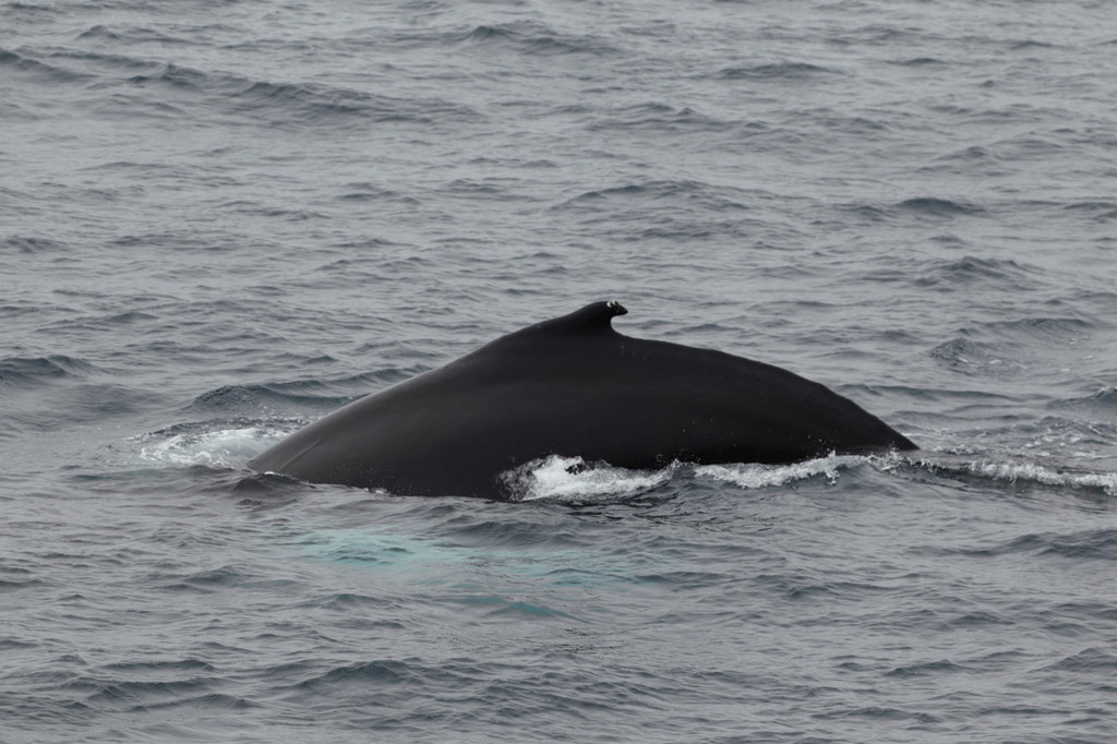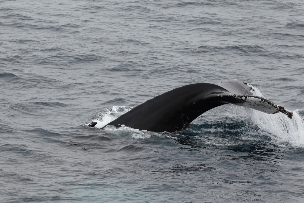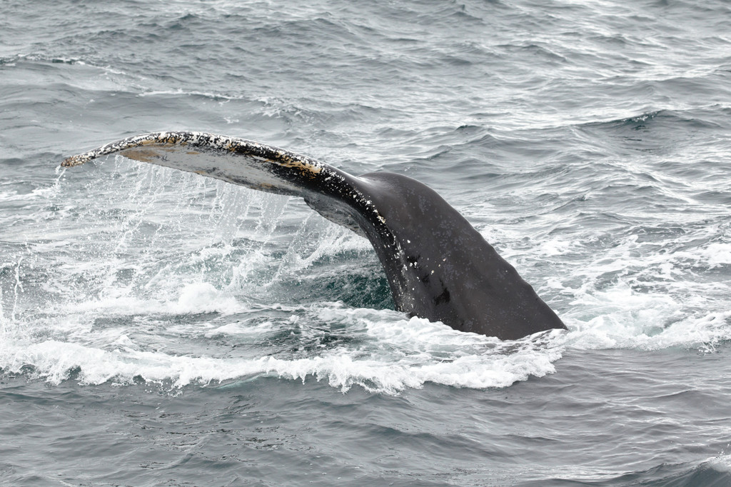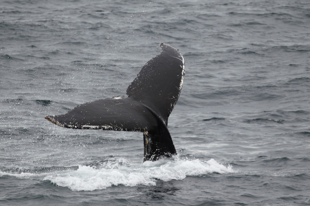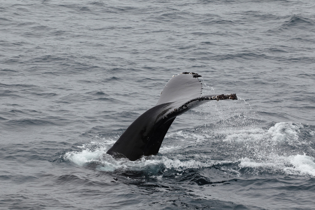 不是每只鲸鱼,都有上面精彩的连贯表演。有些鲸鱼只露出背鳍就急忙下潜,而这只鲸鱼非常友好,下潜前展现的带水尾鳍很好看,似一挂珠帘。