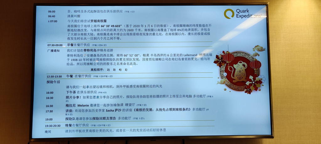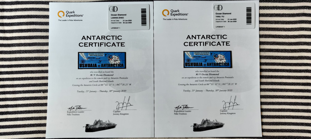 全部极友每人获得船长吉里、探险队长尼奇签名的南极探险证书,上面写着:2020.1.21——30日,我们曾穿越南极圈。证书右上方是我们的房卡,船方送给每一位极友留作纪念。