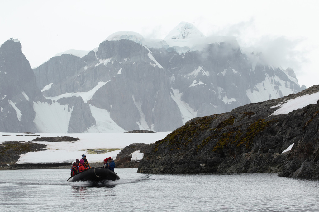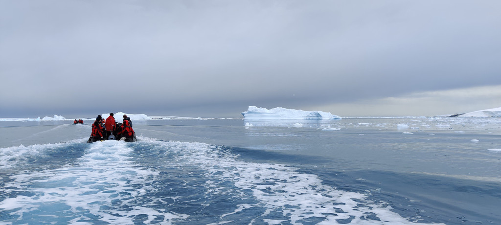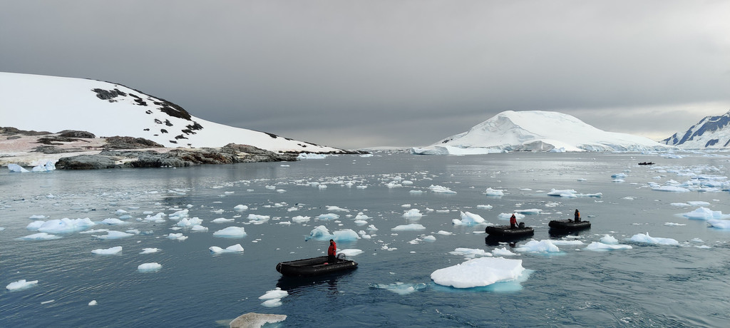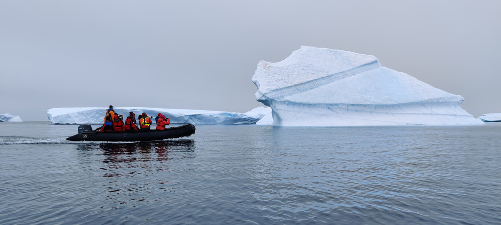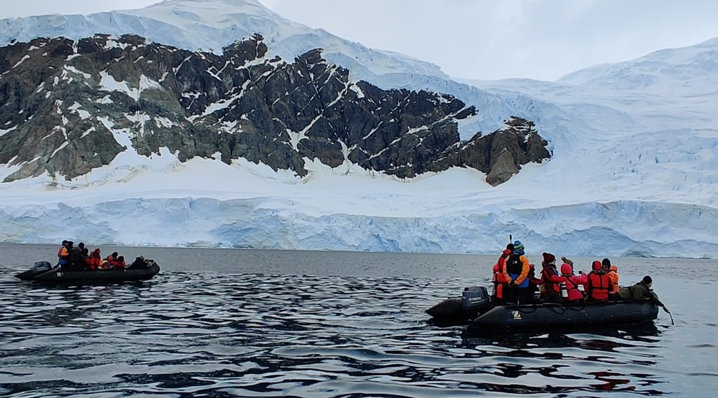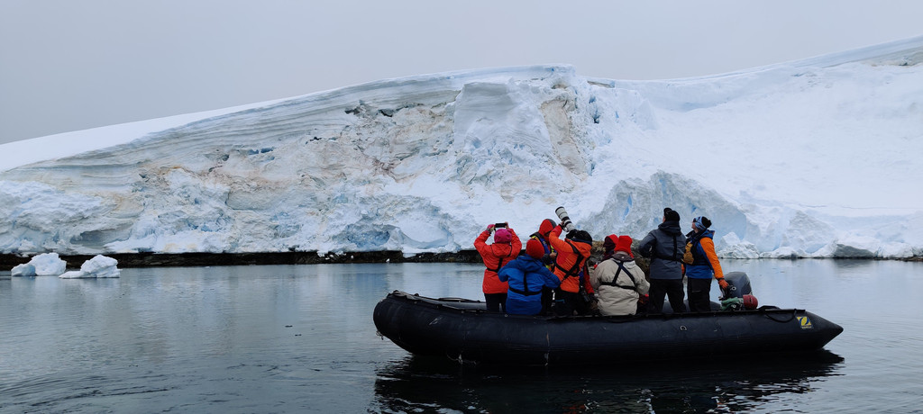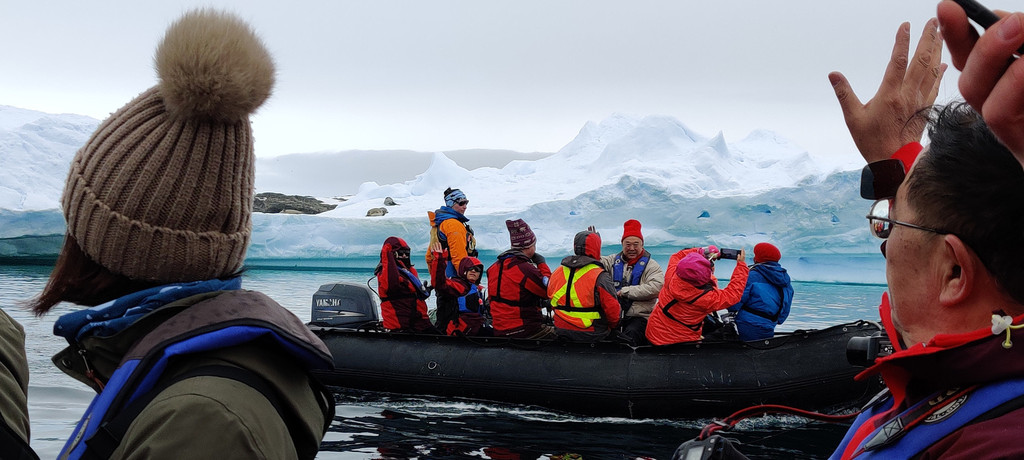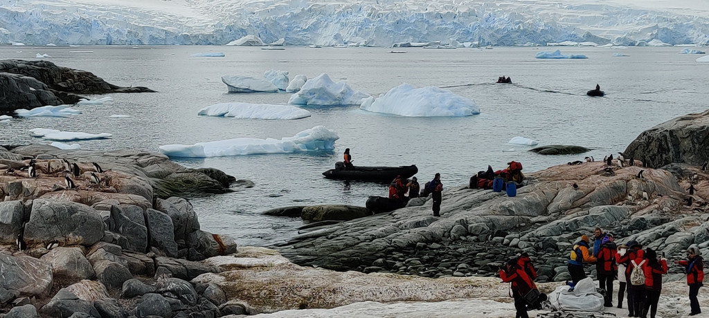 前面谈到,南极公约规定,每次登陆人数不能超过100人。我们全船总共197人(有少数老人不登陆),加上20名探险队员,18只冲锋艇需分为两组,一组登陆一组巡游,一个半小时后互换,登陆和巡游顺序也是下次互换,昨天上午的彼得曼岛我们是先巡游,那今天上午则先登陆。
