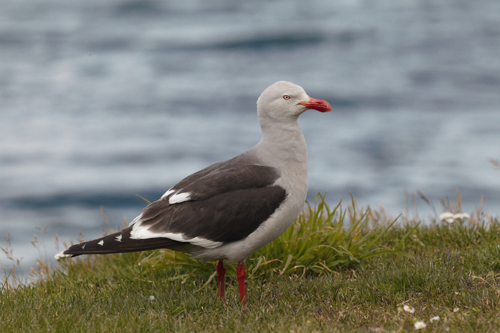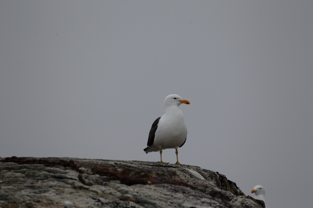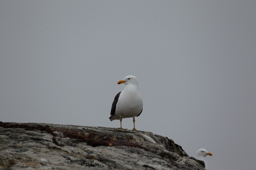 远处岩石上的两只黑背鸥,Kelp Gull,左顾右盼,像是在寻找什么。它们主要生活在南半球,在南极岛屿很常见,以腐肉为食。