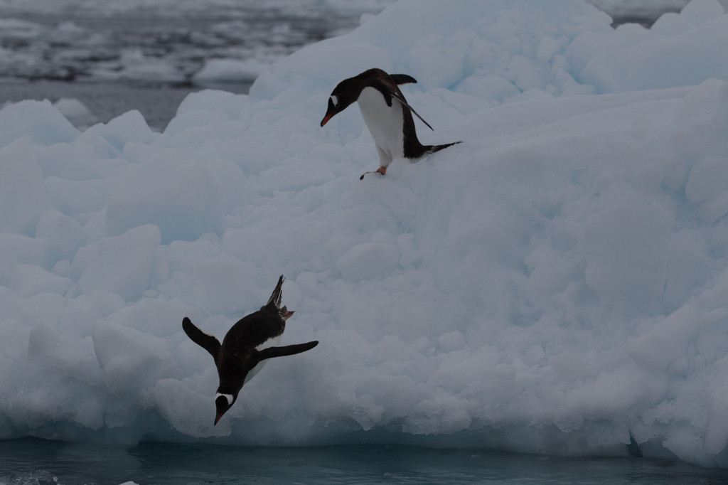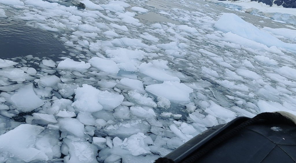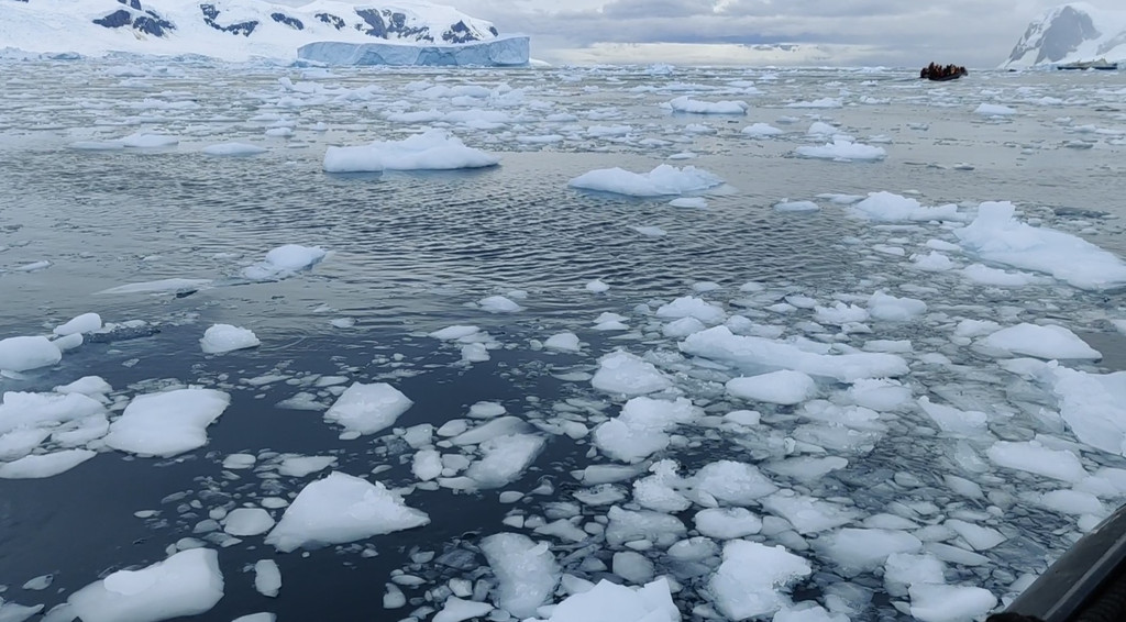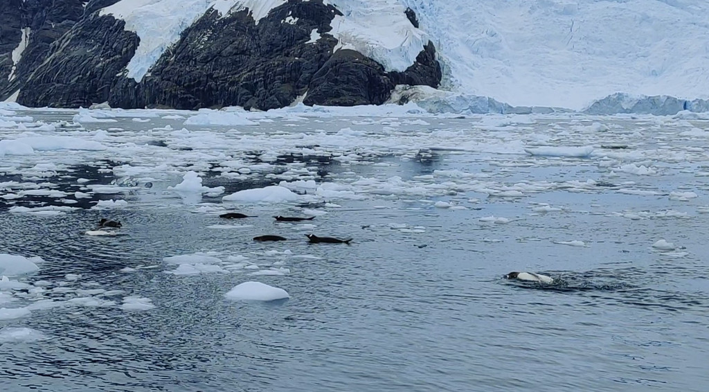 水中浮冰连片,企鹅穿梭在浮冰中时隐时现,恍如置身仙境。
