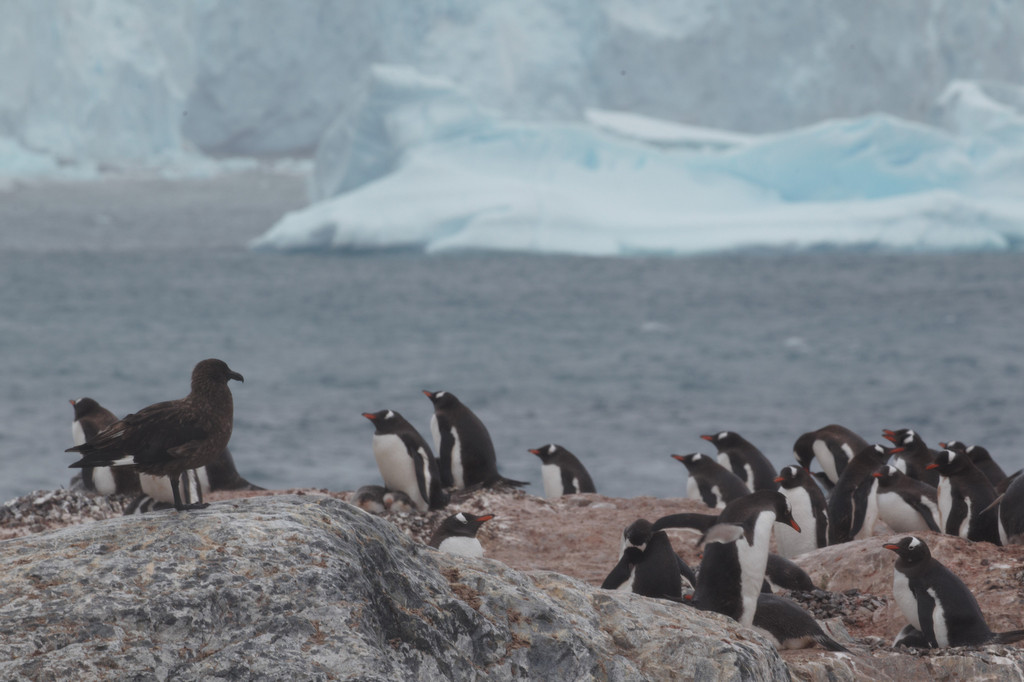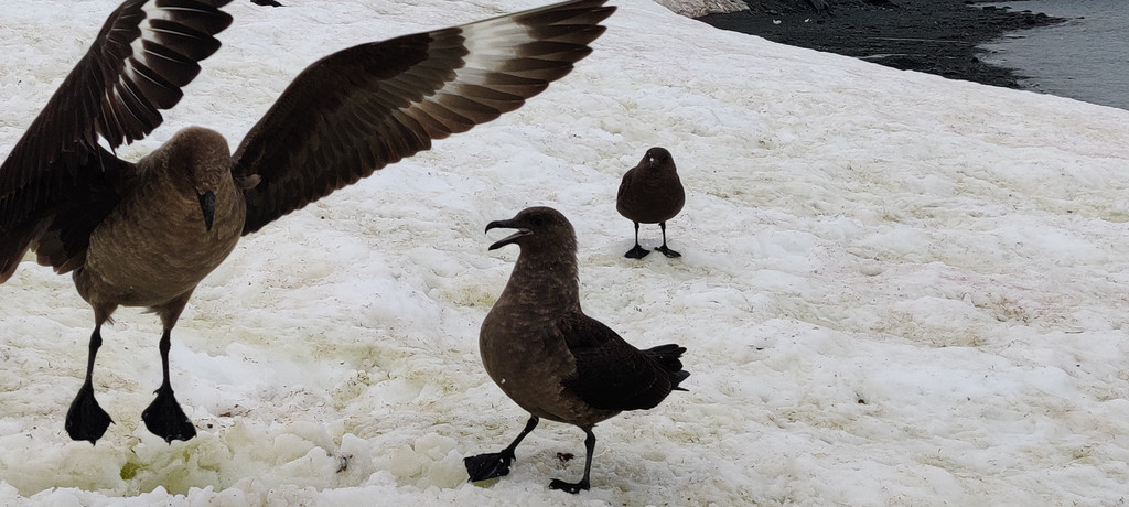 在库弗维尔岛时,近距离见到了企鹅的天敌—贼鸥,它们不怕人,还用像钩子一样的尖嘴叼抢我们手中登山杖的绳套,可见不是一般的凶悍。