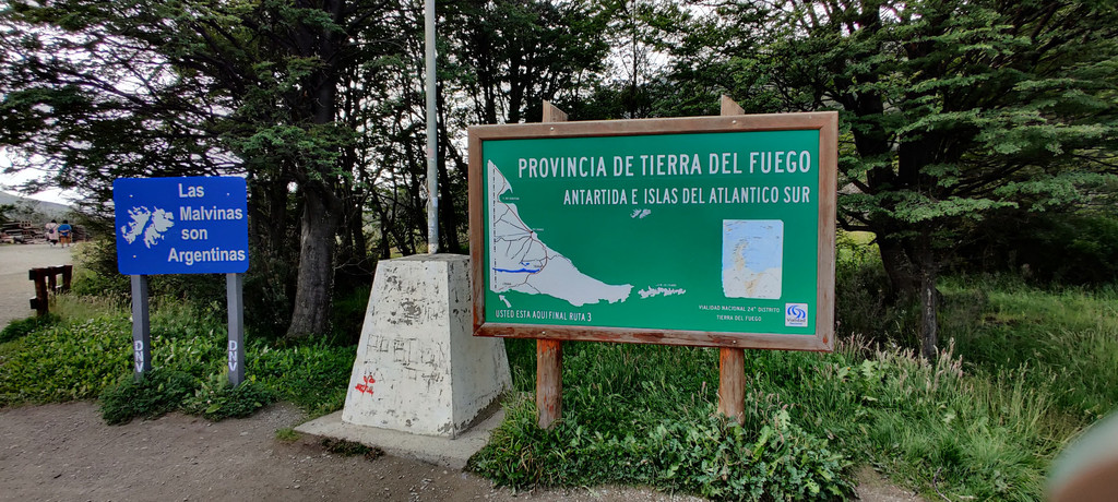 “阿根廷国家三号公路尽头”的标志牌,上面标注:这里是泛美公路的终点,距布宜诺斯艾利斯3,079 公里,沿泛美公路北上至美国阿拉斯加则有17,848公里。