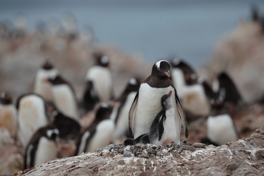 陆地上,虽然成年的企鹅并不会受到威胁,但贼鸥却会抢夺它们的蛋和幼企鹅。这只贼鸥降落在企鹅群里,企鹅的目光都转向虎视眈眈的贼鸥,全力保护自己身下的小企鹅。