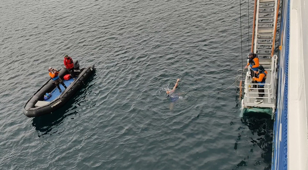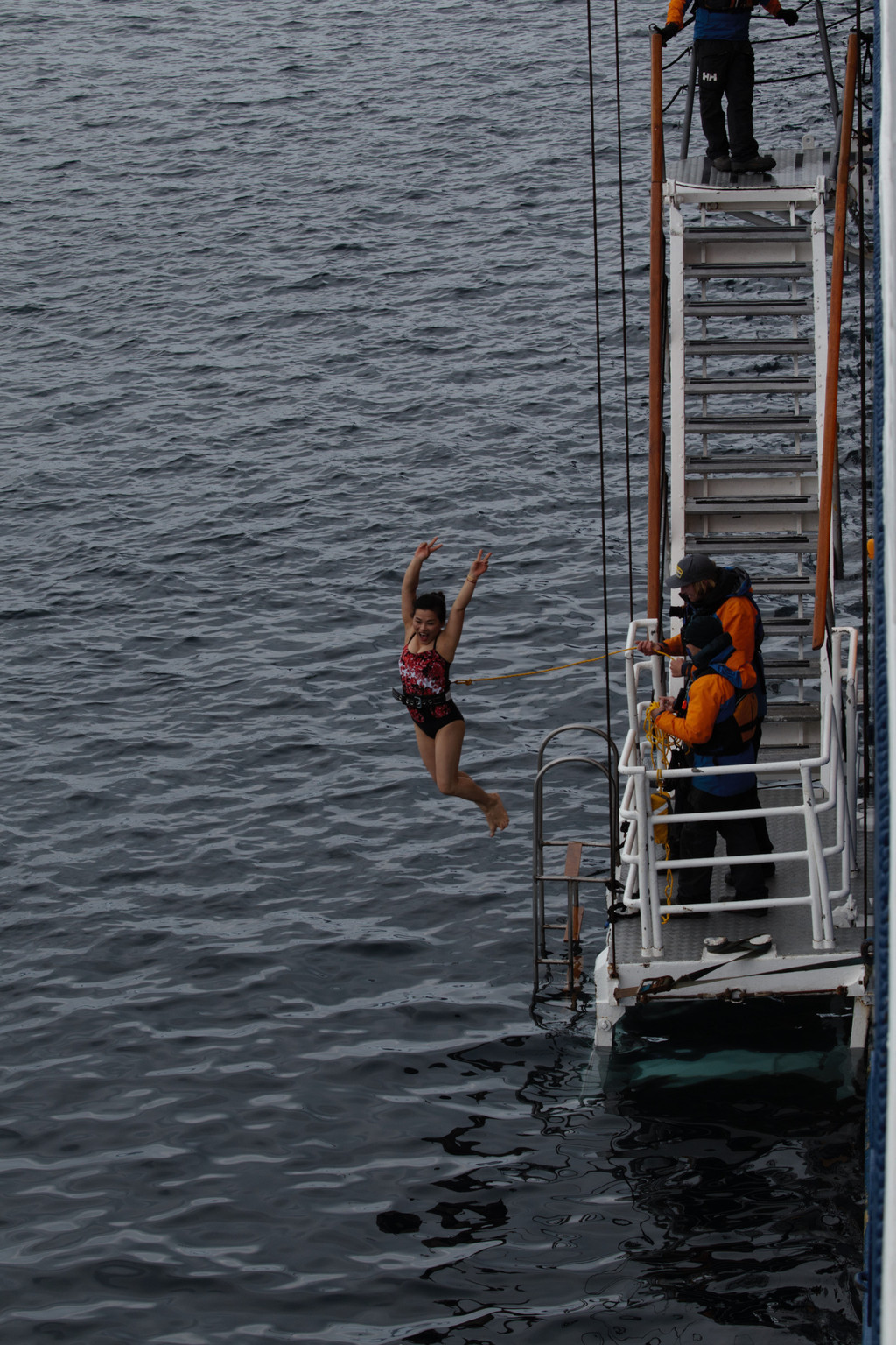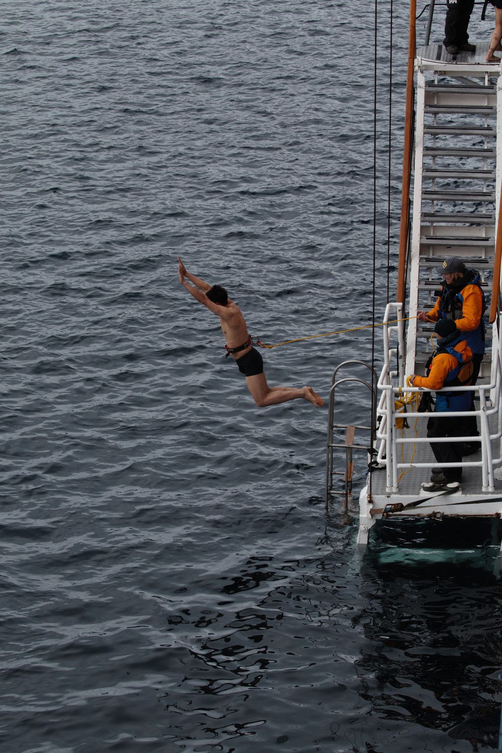 离开利马水道,在宽阔平静的海域开始了南极跳水。有几十人踊跃参加,虽有年龄限制,但60开外依然有人参与。