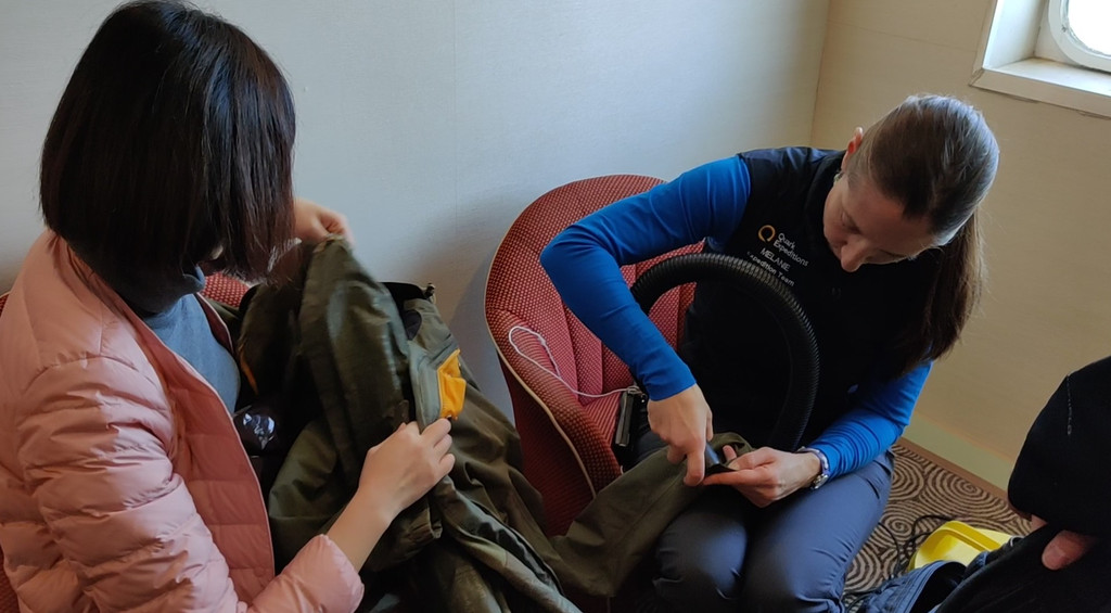 穿衣提示:船上授课时有提不能穿棉质内衣,主要是若大量出汗,棉质材料吸汗后不易挥发,湿透的内衣黏附在皮肤上难以保温。易引发感冒,低温下还易造成冻伤,要引起注意。