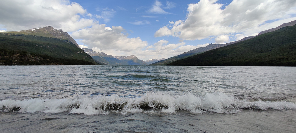 看似静静的罗卡胡,远处的蓝天白云、朦胧的山脉以及眼前此起彼伏的排排浪花,这静与动的美令人流连忘返。领队告诉我们,湖的对面是智利,一湖连两国。