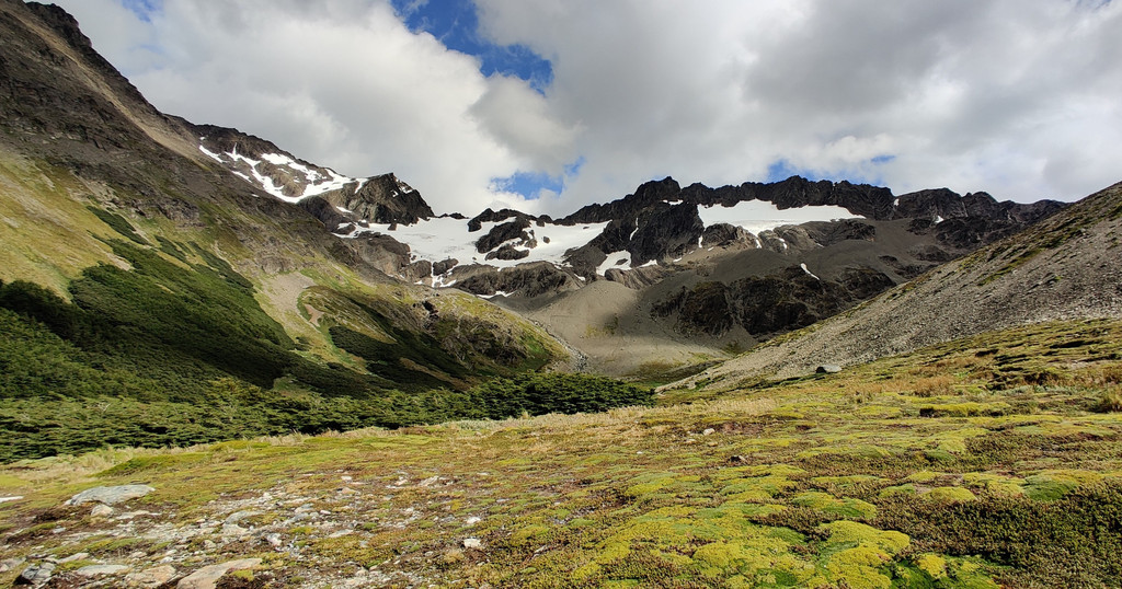 马尔帝斯冰川下面的无遮蔽地带,生长着大片绿茸茸的苔癣。原始风貌一览无遗。