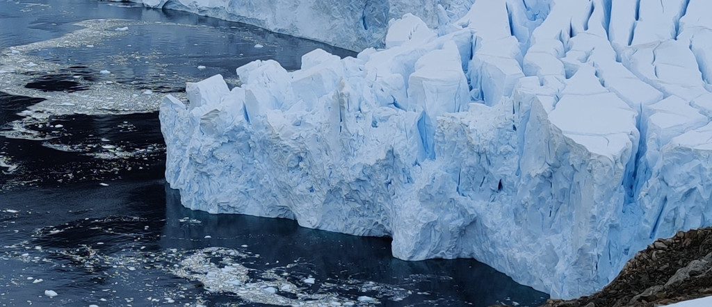 冰川巨大的冰舌在这里伸入海中,时有雪崩发生冰层断裂。我们有幸两次听到到冰雪狂泻的如雷巨响,随着震耳的轰鸣声,冰川前沿涌入海中。这是极其震撼的景观。