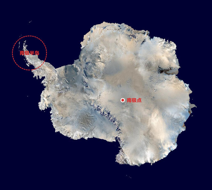 从下图来看,图中央红色位置就是南极点了,在南极点附近坐落着美国阿蒙森斯科特科考站。而图中红圈标注的区域,便是南极半岛区域。大部分南极旅行者们,都会选择在这一区域附近游览。