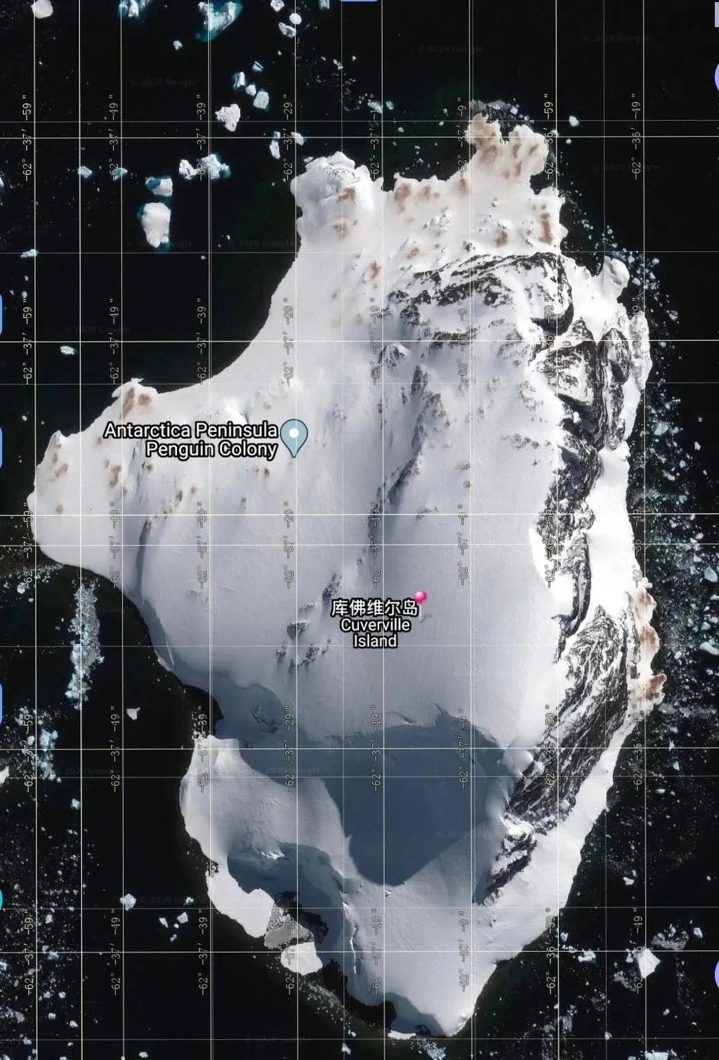 (卫星图上的库佛维尔岛。小岛常年冰雪覆盖,白茫茫雪山冰原,惟有东侧、北侧大面积黑岩裸露。沿海岸可见成片的浅褐色,斑块般镶嵌,那便是被企鹅粪便污染的巢区。浮冰围岛,星罗棋布)