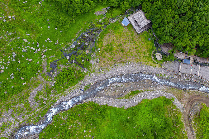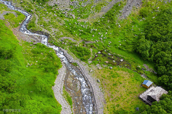 我尤其喜欢将镜头升到空中,俯拍这里的盛景,这是我用肉眼领略不到的。漫山遍野的碎石躺在碧绿的山坡上,还有几座小房子随之而居,我想,生活在这里,日出而作日落而息,简直是现代的桃花源。
