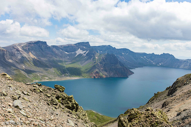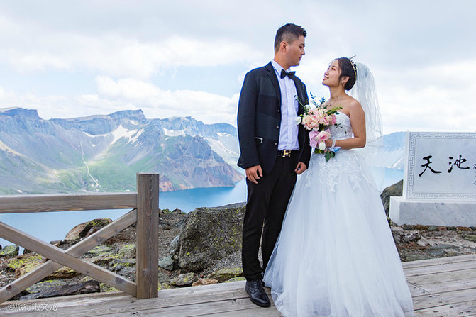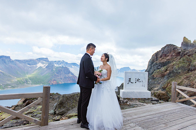 棉花糖般的云朵席卷而来,覆盖了整片天空,天池就宛如一颗皎洁的明珠,倒映在地面上。在炎热的酷暑,来这里拍婚纱照绝对是明智之举,既能与秀丽风景作伴,又能远离骄阳。