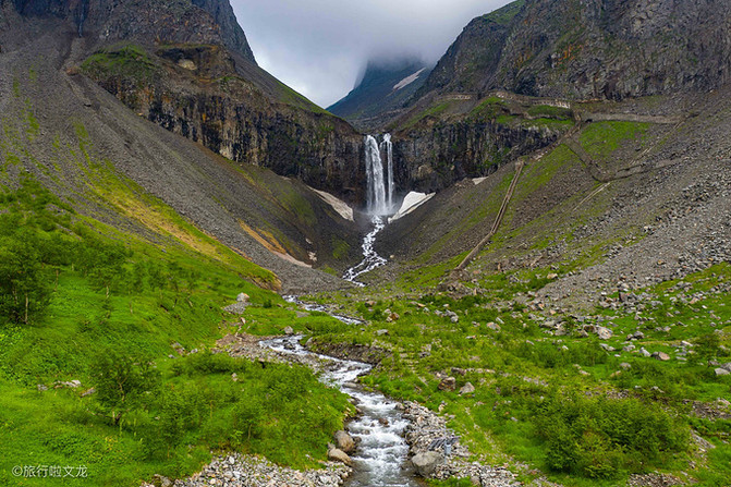 一进入瀑布的境地,我瞬间被眼前的景象惊呆了。远处的一条瀑布似乎从天上淌下来的白丝绸似的,笔直的垂向地面,溅起一层层浪花,大有“飞流直下三千尺”之奇观,湍急的河水在阴云笼罩之下更增加了一丝神秘感。