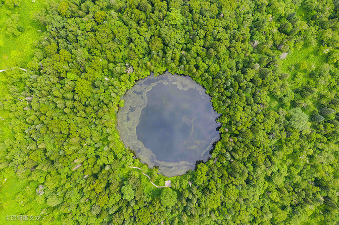 沿着花海中的栈道就会走到这个景点的目的地王池,一个圆形的湖水镶嵌在茂密的丛林之中,神奇感叹。