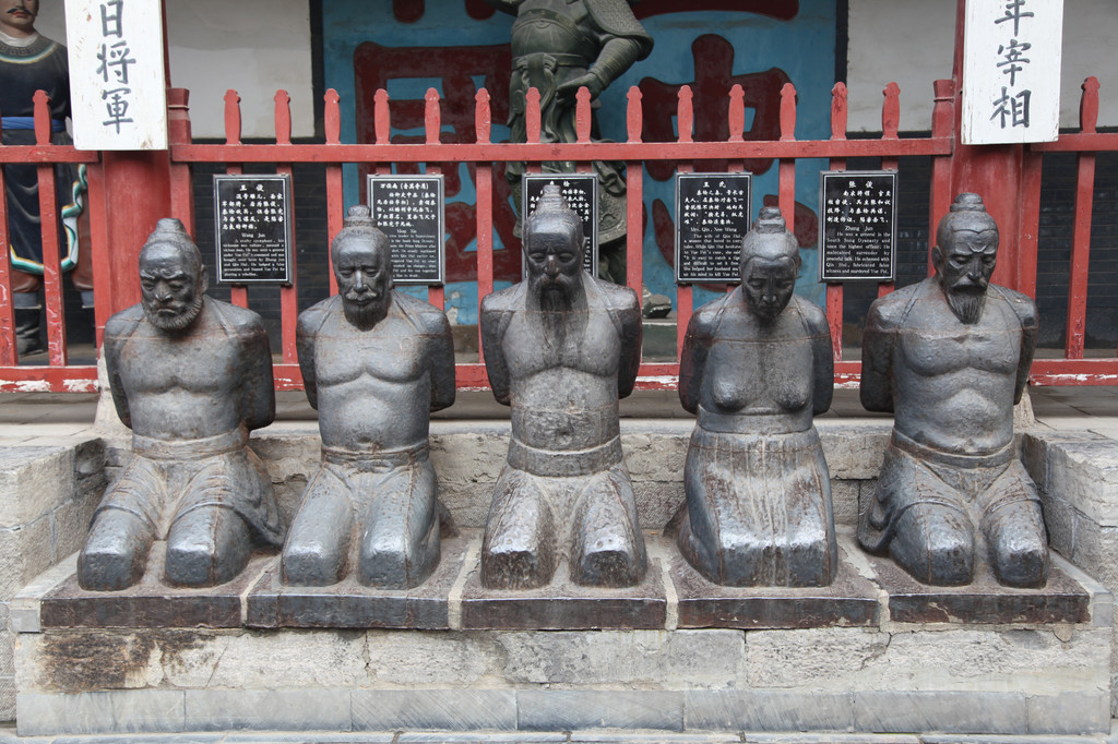 前面五个跪着的人,就是设计陷害岳飞的罪人。身后举着长剑的将军,叫施全。因为替岳飞打抱不平,行刺秦桧失败,被虐杀。后人感其忠勇可鉴,立像于岳飞庙