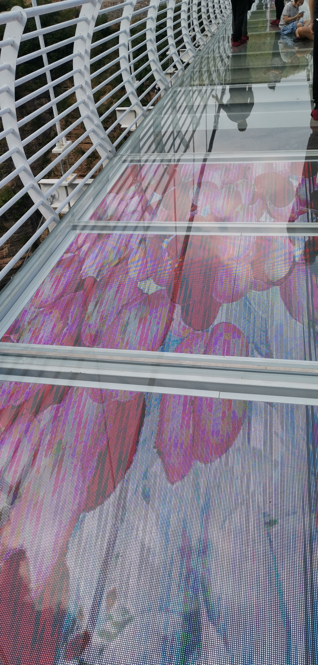 天桥中间有一段是3D影像玻璃,人行走在上面玻璃会发出破裂之声像,似乎一踩就碎,步步惊心。桥面长280米,横跨两山之间,桥面全部采用透明玻璃铺设,桥面完全透明。站在桥上,整个人仿佛空中漫步,脚上脚下全是景。
