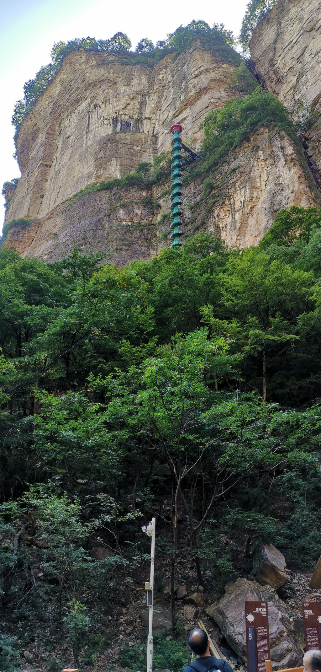再沿摩天筒梯盘旋而上。此筒梯,高88米,直径3米,是进入下一游览区的必经之路。众人鱼贯上行,惊叹胆怯声不绝于耳,这可是练胆量的好地方!