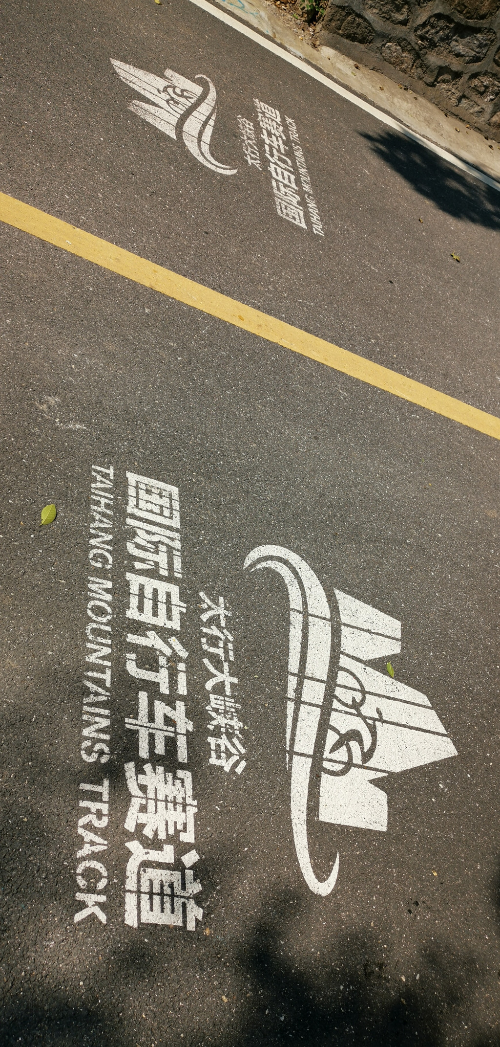 又坚持上到顶端,仿佛又是一个世界,山顶上的道路随山势盘旋,整洁而亮眼,路上印着“国际自行车赛道”字样。