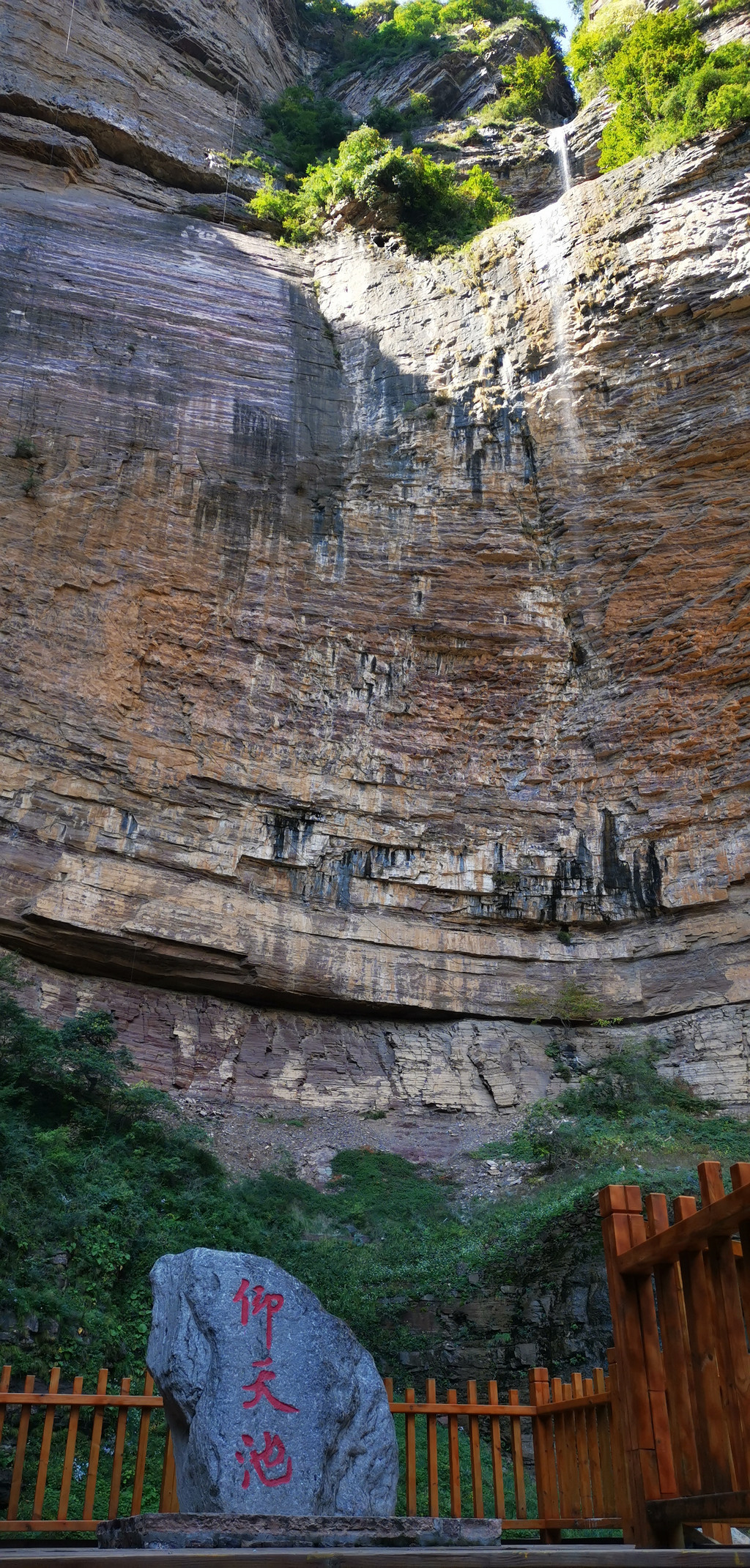 过栈道、森林浴廊,抬头看,只见一股清泉自上而下跌落,如银似练,百米高崖,飘飘洒洒,万般迷人。崖下一水池,是为仰天池。