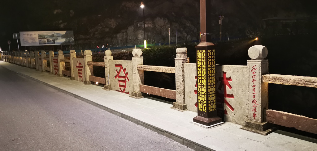 石板岩大桥,这是一座一九七六年七月一日通车的大桥,两侧栏杆上有“世上无难事、只要肯登攀”标语。