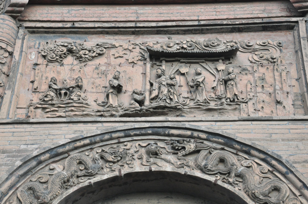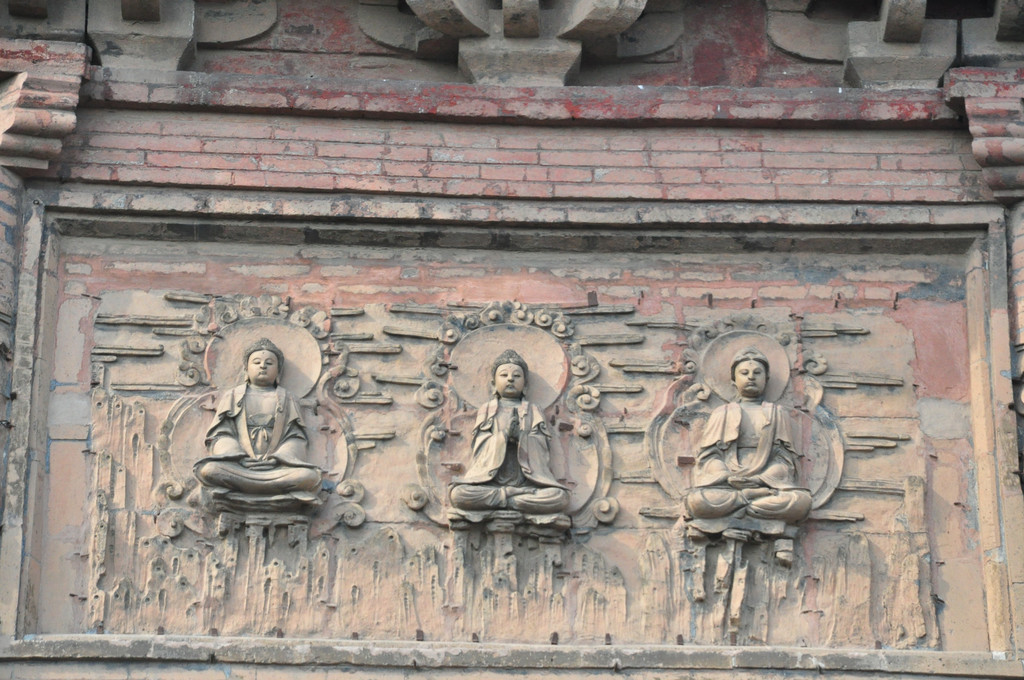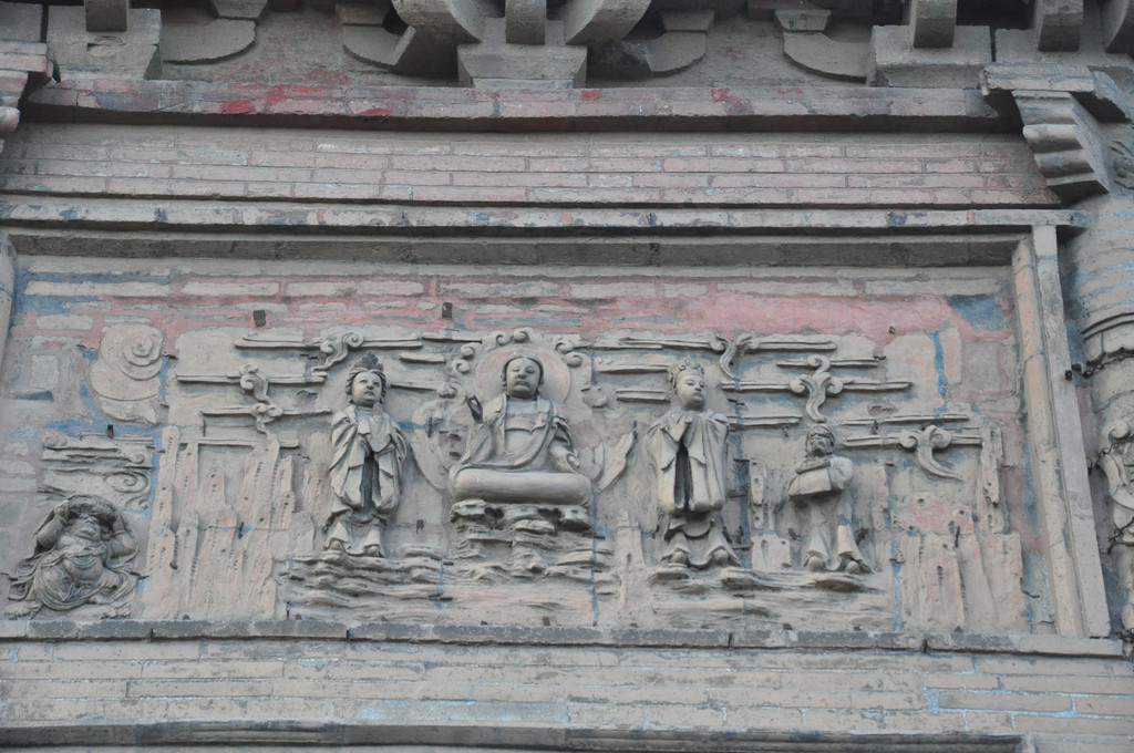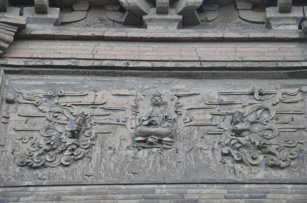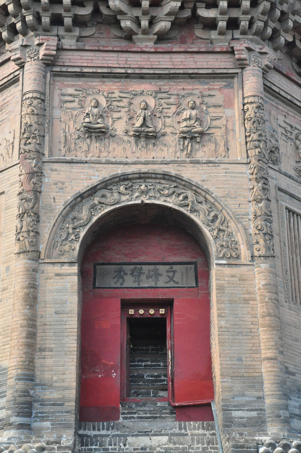 文峰塔由塔基、塔身、塔刹三部分组成。塔基高2.6米,平面呈八角形,基上有螺髻状莲瓣七层,上下交错,砖质磨成,塔身座在莲瓣上。塔身第一层高大,以上四层低矮,直径逐层增大,以上檐水不滴下檐为限,形成上大下小的优美外观。每层檐下有砖质斗拱承托出檐,二至五层塔身有相互交错的通风口,使塔身不因通风口集中于一条垂直线而出现裂缝。每层檐角均悬有铜钟,微风徐来,叮当之声悦耳动听。给人以高远静穆之感。塔体由八角形基座、须弥座、圆形金刚圈、瓶身等组成,高10.8米,基座上留有两个对称的通风窗。尤其在八根龙柱之间,有八幅砖浮雕佛教故事图像:正南面为三身佛像;西南角是释迦佛说法像;西面为悉达多太子诞生图像;西北角一幅是释迦佛雪山苦行修定像;北面为观音菩萨与善财龙女像;东北角是佛为天人说法像;东面一幅为释迦佛涅像;东南角是波斯慝王及王后侍佛闻法像。这些浮雕造型生动,神情逼真,姿态自然,栩栩如生,是不可多得的艺术珍品。