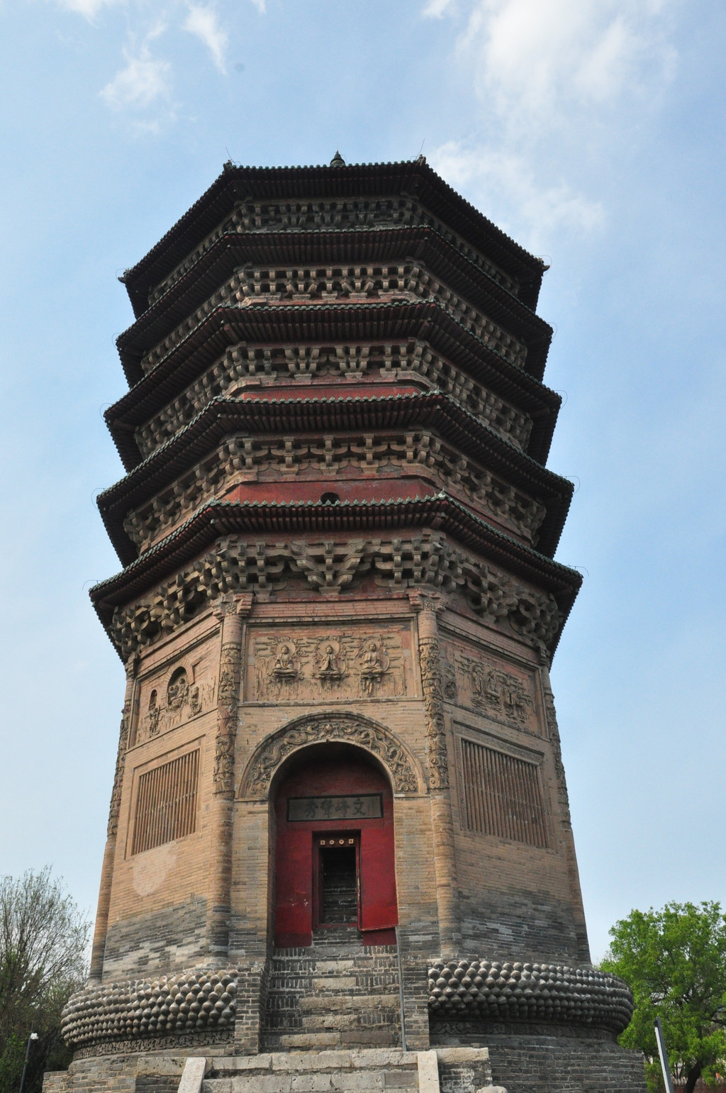 下午3点15分出来,乘18路公交到文峰塔下,去看天宁寺。文峰塔位于河南省安阳市古城内西北隅,高38.65米,周长40米,因塔建于天宁寺内,原名天宁寺塔;又因位于旧彰德府文庙东北方,作为代表当地“文风”的象征,故又称文峰塔。文峰塔建于五代后周广顺二年,已有一千余年历史 ,为全国重点文物保护单位。 文峰塔五层八面。浮屠五级上有平台,下有券门,每层周围有小园窗。塔坐落在一个高达二公尺的砖砌台基上。文峰塔的建筑,富有独特的风格,具有上大下小的特点。由下往上一层大于一层,逐渐宽敞,是伞状形式,这种平台、莲座、辽式塔身、藏式塔刹的形制世所罕见。
