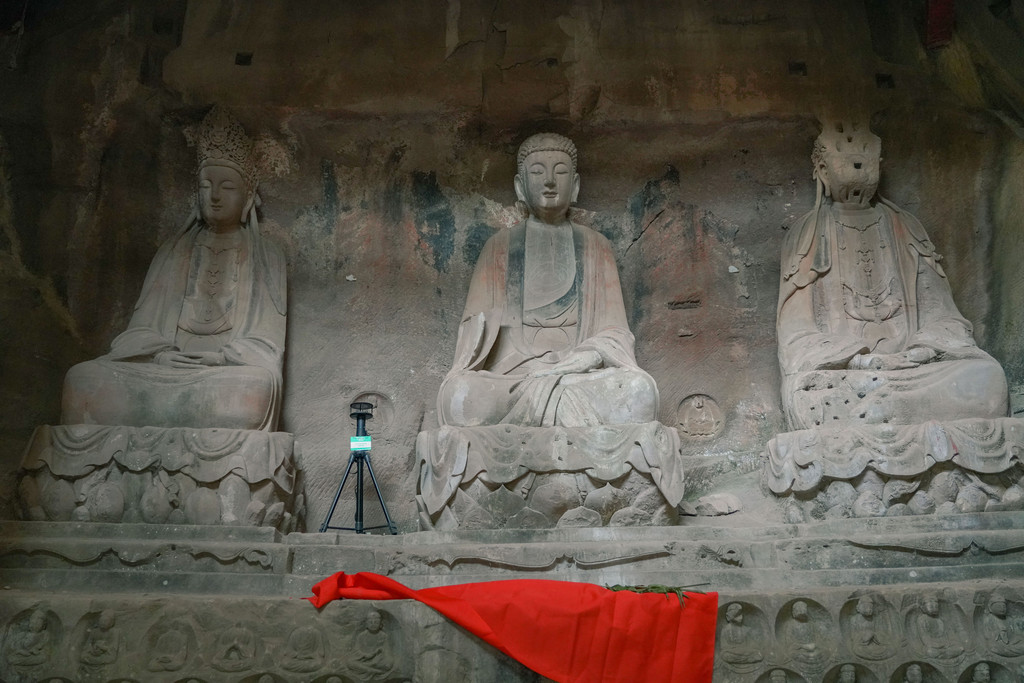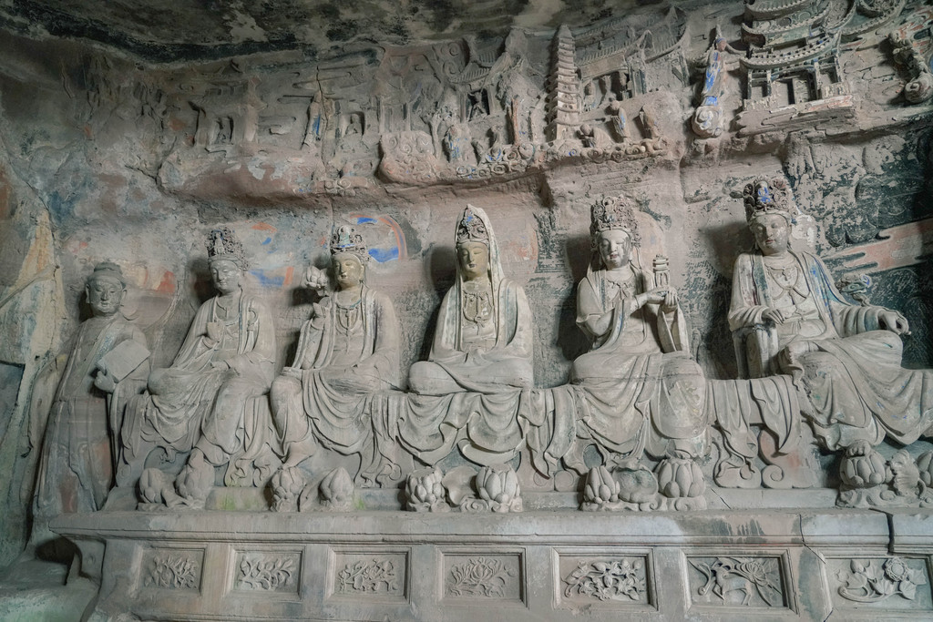 这一窟石刻造像在全国仅有两窟,一窟在安岳毗卢洞,一窟在大足。但安岳石刻比大足石刻早了大概400多年。
