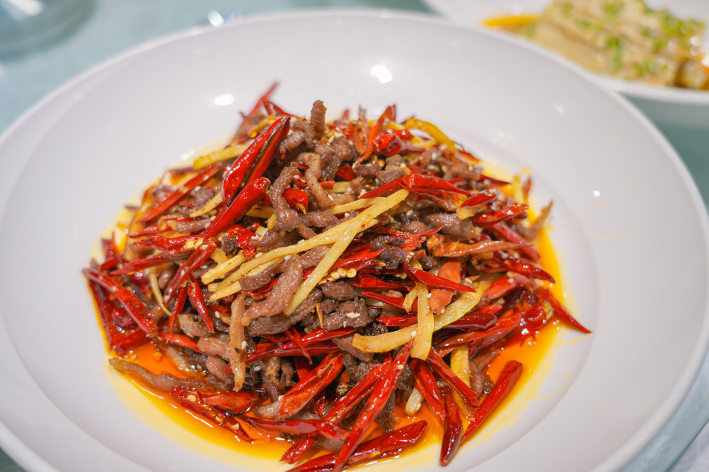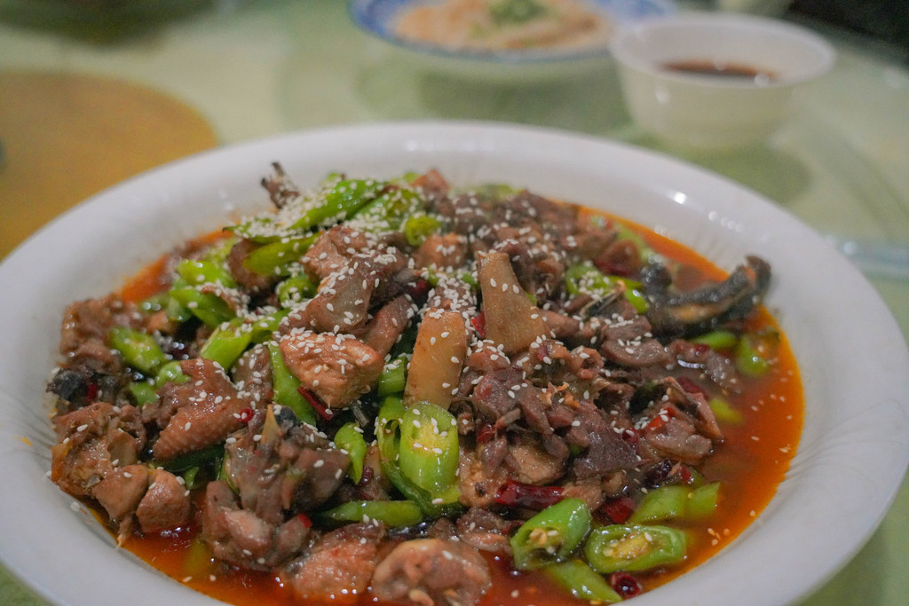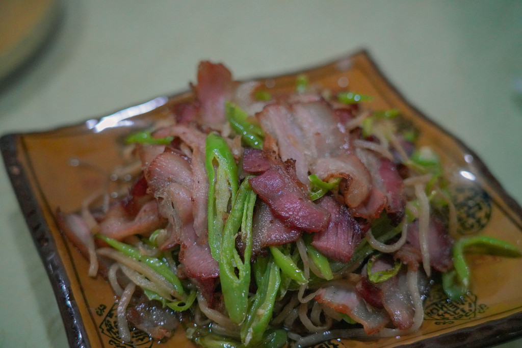 辣椒炒坛子肉,坛子肉的口感有点像腊肉,但是与腊肉不同的是,坛子肉是将猪肉放在土坛里,数月之后,形成了风味独特的美食。