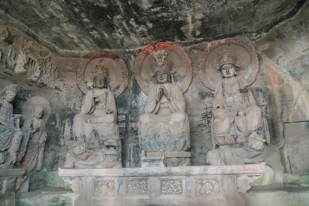 华严洞以正中间的“华严三圣”为主,中坐毗卢遮那佛,左右分别是文殊和普贤。