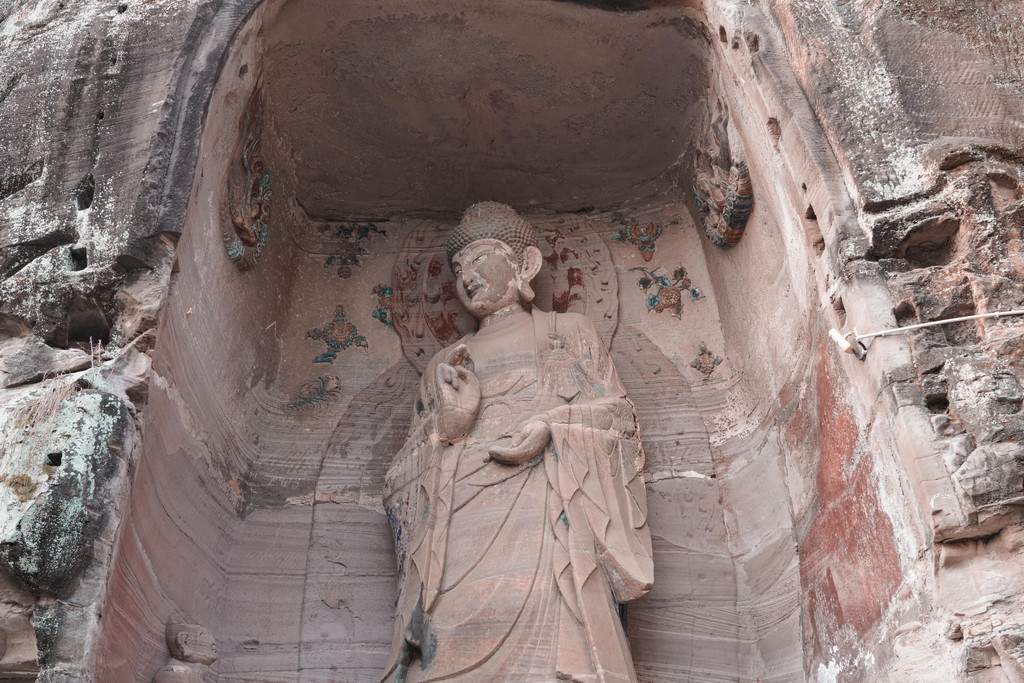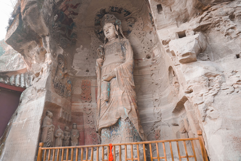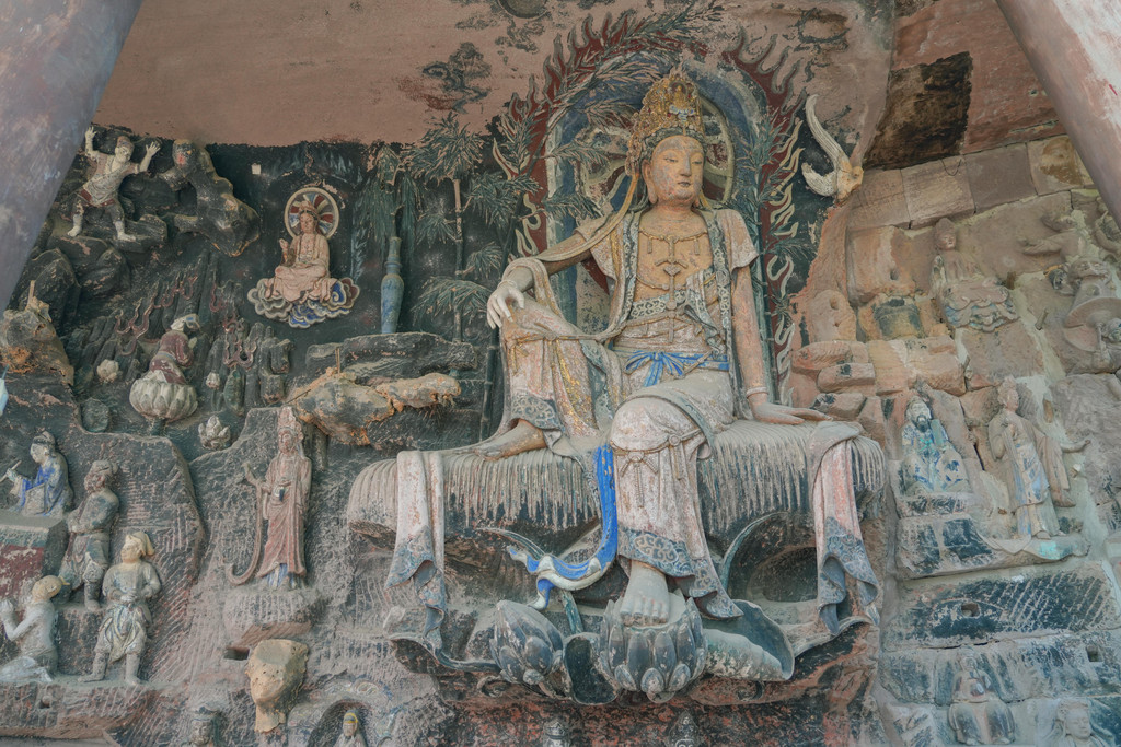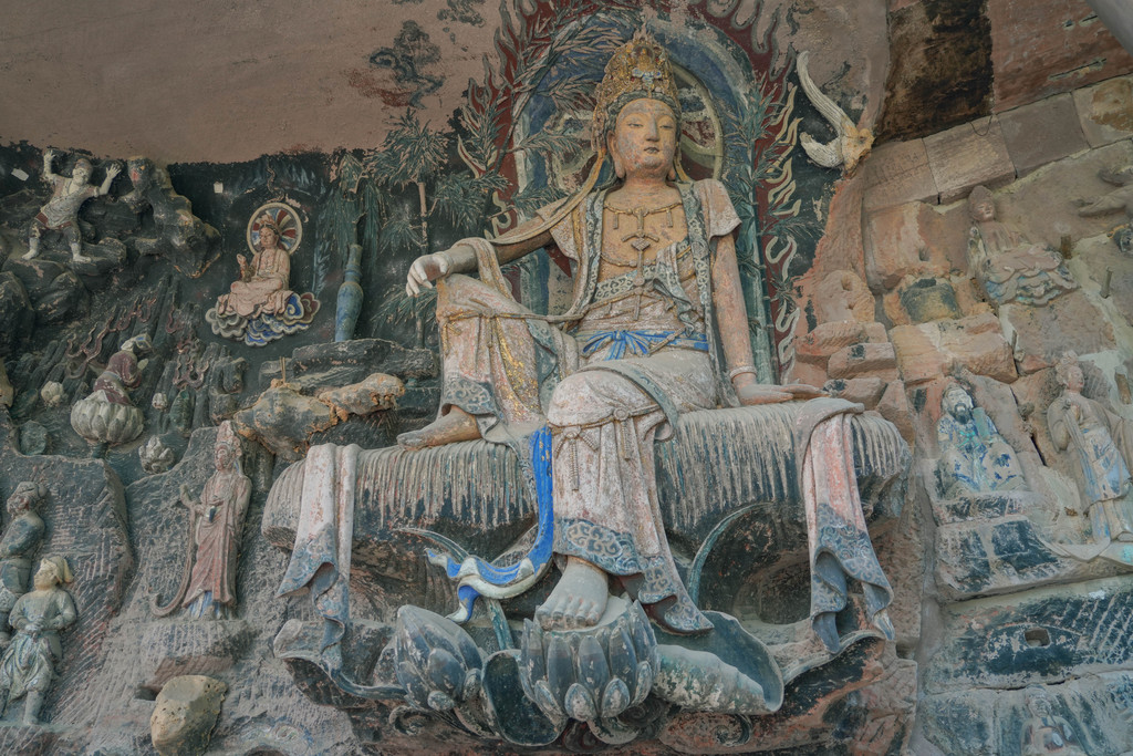 莲花手观音,高6.8米,刻于北宋,头戴双层叠加全镂空宝冠,面容慈祥,神态自如,是整个圆觉洞保存最完整,雕刻最精美的一尊菩萨造像。最具特色的是,菩萨手中手持莲蕾,重达百斤,却千年不坠,悬空而不掉,其原理是莲杆,莲蕾与袈裟袖口构成了一个三角形,三角具有稳定性。不得不感叹古代匠人的聪明才智。