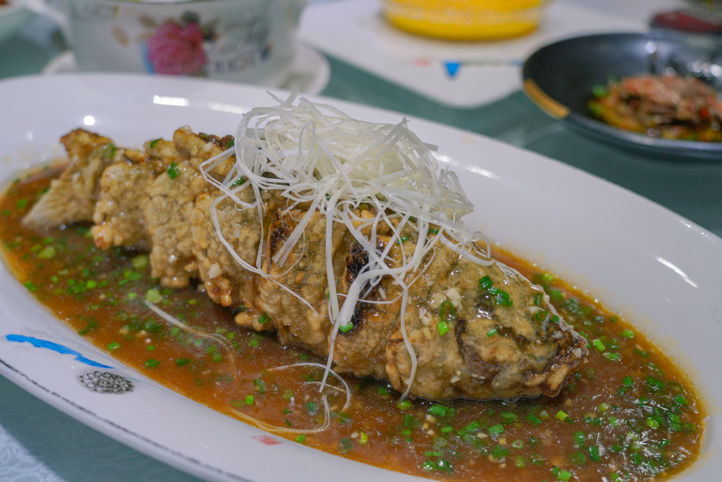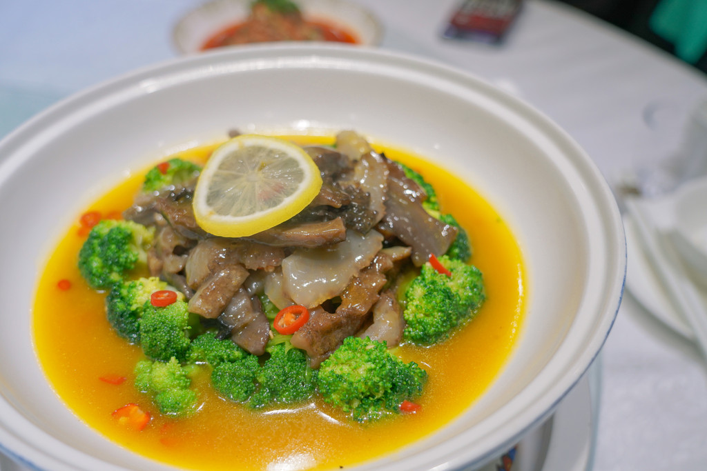 每一道菜里面都有柠檬的元素,柠檬酸汤辽参,酸酸辣辣的,很是可口。柠片煸肉丝,是我特别钟爱的一道菜,咸香味浓,色泽棕红,干香酥软,搭配柠檬丝,不会觉得涩口,反而很清爽,特别下饭。柠香脆皮鱼,表皮酥酥脆脆,搭配盘子里的柠檬酱汁,口感特别独特。