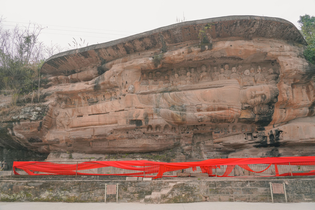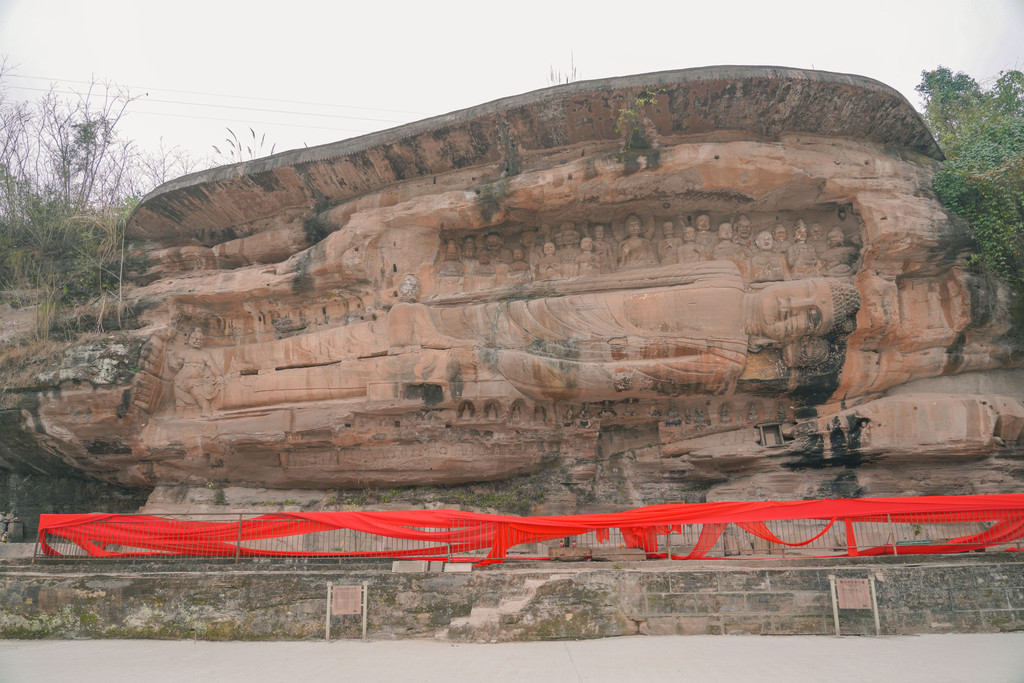 这尊造像依山取势,因地制宜,雕刻了一个相反方向的左侧卧佛,目前是国内最大的唐代全身左侧卧佛。