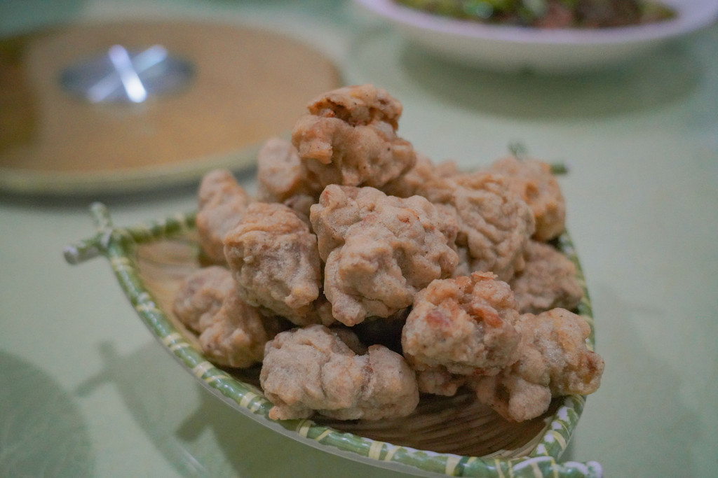这道菜不说你们能猜出来吗?其实它就是酥肉,与其他长条形的酥肉不同,这家餐馆的酥肉就是这样一大块的。用了有肥肉有瘦肉裹一层面粉油炸,酥脆可口,肥而不腻,吃一个完全不过硬。