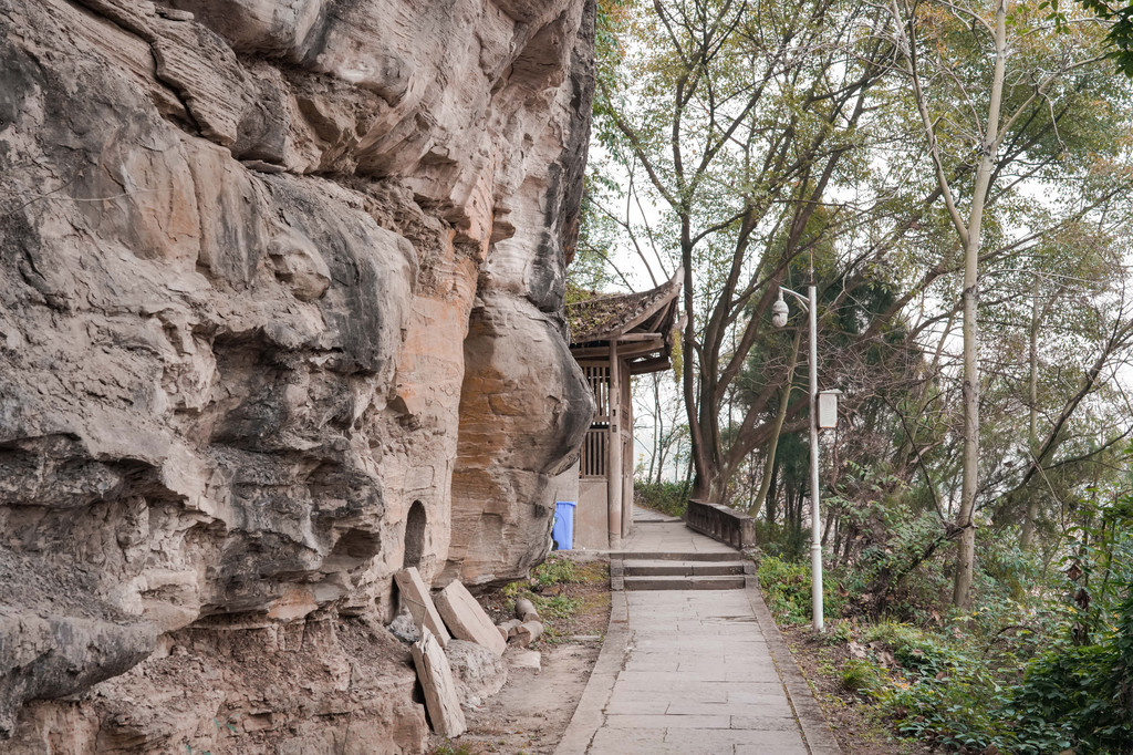 从龟鹤池往前走,就到了南崖石刻区。该区有国内最集中的五代石刻造像,共有千手观音,药师佛造像,千佛窟,十六罗汉等40余个龛窟,题材多达27种。但南崖石刻群损毁是比较严重的。