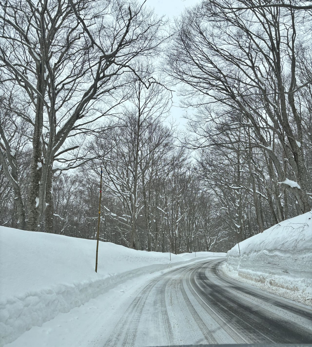 自驾时间大概一个多小时,一半是青森市内道路,一半是冰天雪地的山路。冬天的雪国,就是一张黑白照片。山路做了除雪处理,两边有一米多高的雪墙,道路中间也常有积雪。也许是雪地轮胎性能良好,来回六十多千米,没有一次打滑或者ABS动作的情况。