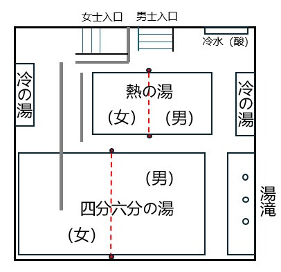 温泉内部禁止拍照,只能用草图展示一下场内的构造(灰色部分为隔板)。酸之汤由热之汤、四分六分之汤、冷之汤和汤泷4个来自不同源泉的温泉组成,成分及酸度也略有差异。热之汤温度41°C,因泡了以后能够长时间保持身体温暖而得名;四分六分之汤温度42.5°C,比热之汤还热,但由于泡了以后身体能够保持温暖的时间只有热之汤的40-60%被称为四分六分;冷之汤温度39.5°C,明显要低一些;泷汤则是三条从上而下的水龙,可以刺激背上的穴位,但温度也比较低。日本的温泉有浴疗文化(日语:湯治,通常是指在温泉地较长时间的疗养),酸之汤针对冷感症开出的处方是“热之汤泡5分,四分六分之汤泡5分,出汗后用冷之汤冲几下,泷汤冲3分,最后再热之汤泡3分”。