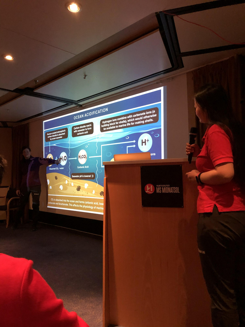 船方每天都会举行各种关于南极、自然的演讲,只要与活动不冲突,我们基本都会去参加。之前的演讲,我们也都去了,不过为什么之前的都不贴出来,而把今天的这个演讲单独贴出,因为我想让更多的人知道大洋酸化,这是一个不亚于全球气候变暖的环境杀手,只有更多的人正视它,才会有更多的力量来解决这个问题。