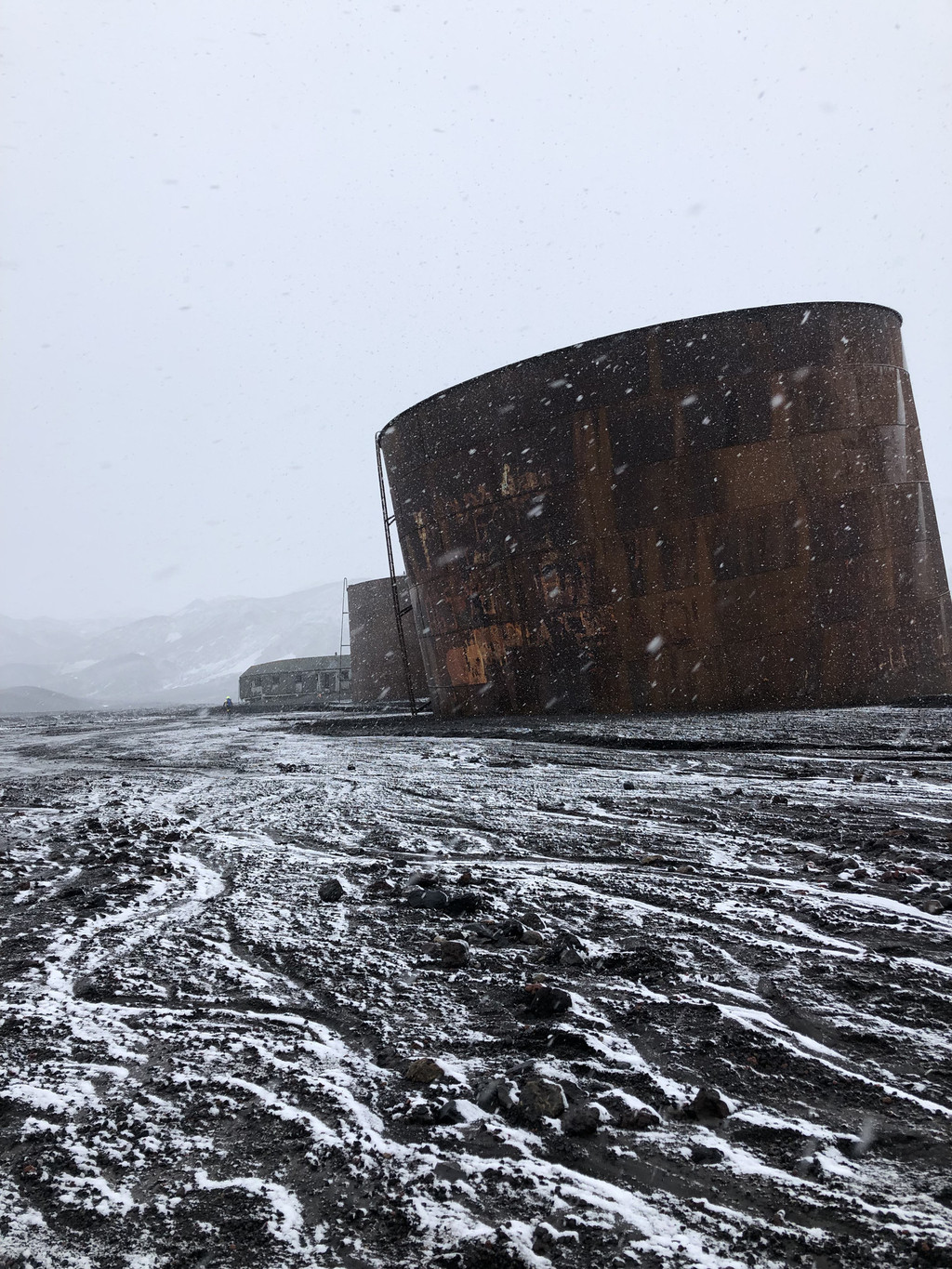 岛上除了大量遗迹以外,还有大量的南极海狗,它们在岸边嬉笑打闹,丝毫不在意我们的到来,另外,岛上还有一对留守的来自挪威极地研究所的科研人员,他们住在岛上的帐篷里,每半年或一年进行一次轮换,在我们登岛的同时,他们也登船改善一下伙食、进行了一次难得的沐浴更衣并给我们带来在捕鲸者湾野外工作的介绍,很难想象他们是如何在如此恶劣、单调的环境下进行科研和生活的,对于他们,我们只有崇敬。我们在这里还进行了冬泳活动,真的很佩服下水的猛士们,可惜本人不会游泳,又担心万一感冒发烧影响接下来的行程,如果是晴好天气也许咬咬牙也就下水走一圈了,但那天却是天空阴霾,寒风夹杂着雪粒打在身上啪啪作响,蠢蠢欲动的内心只能作罢。